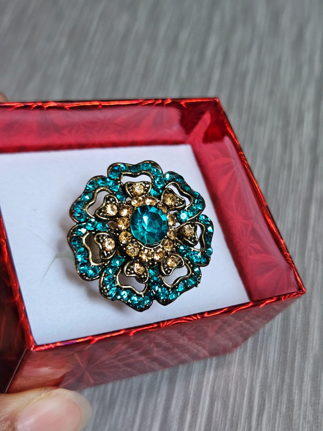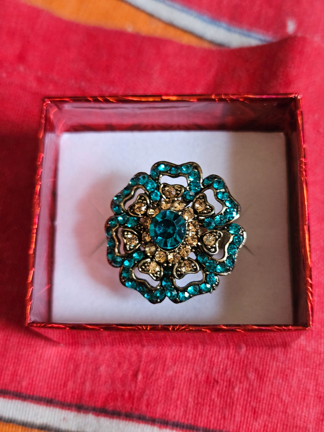 Beautiful ring. Features teal and gold stones. Intricate design. Comes in a red gift box.