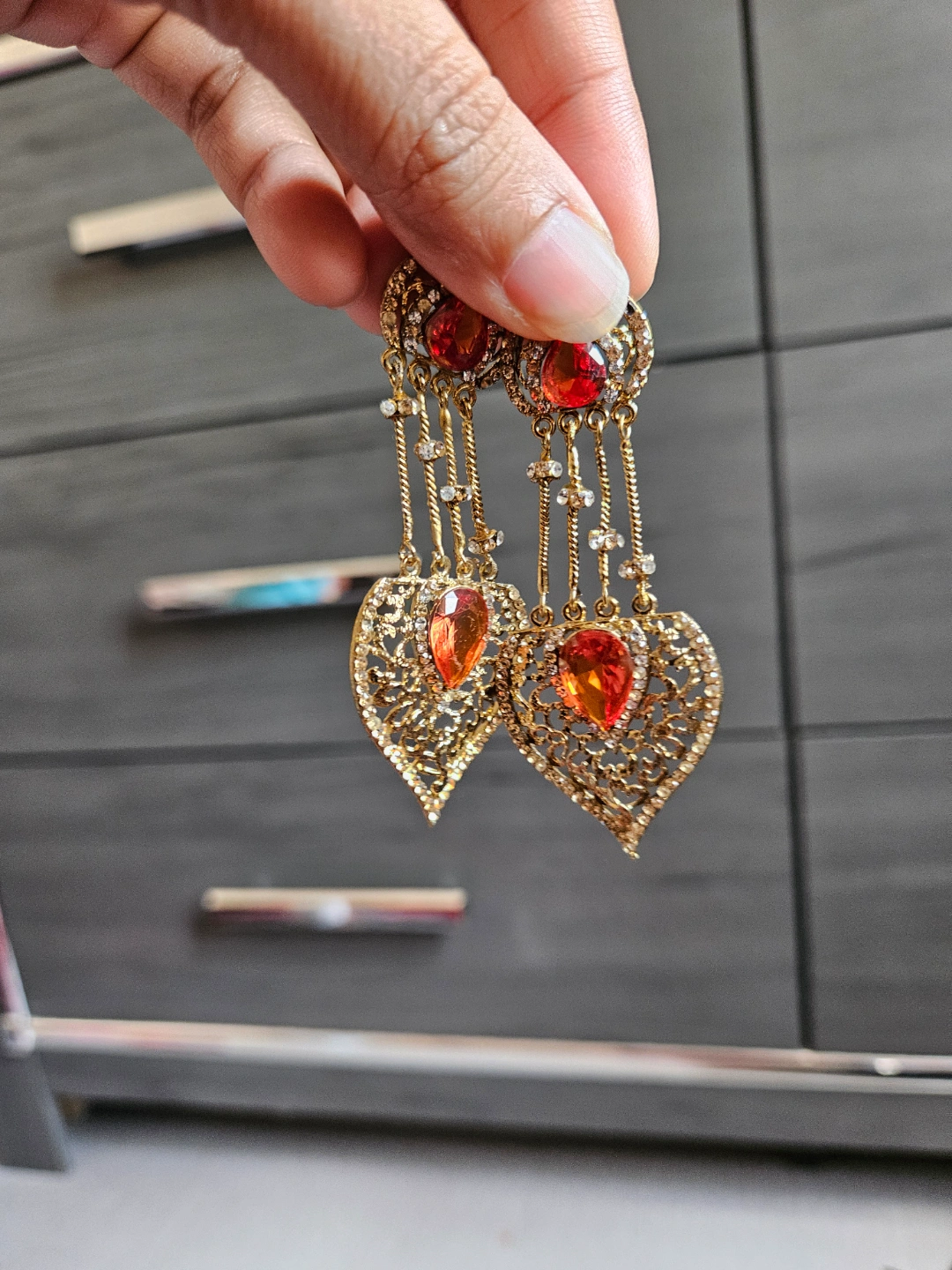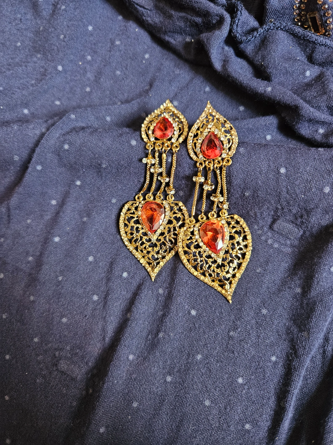 Beautiful gold tone earrings. Features red and clear stones. Filigree design. Long drop style. Perfect for adding a touch of elegance to any outfit.