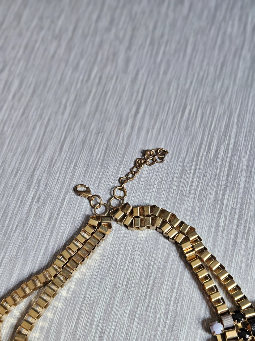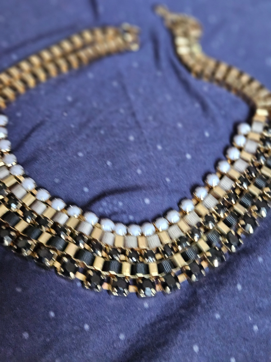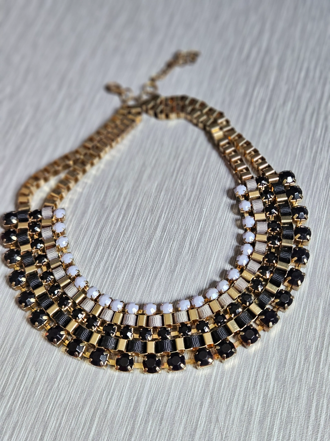 Multi-layered statement necklace. Gold chain with black and white crystals. Features a lobster clasp closure. Great for adding a touch of sparkle to any outfit.