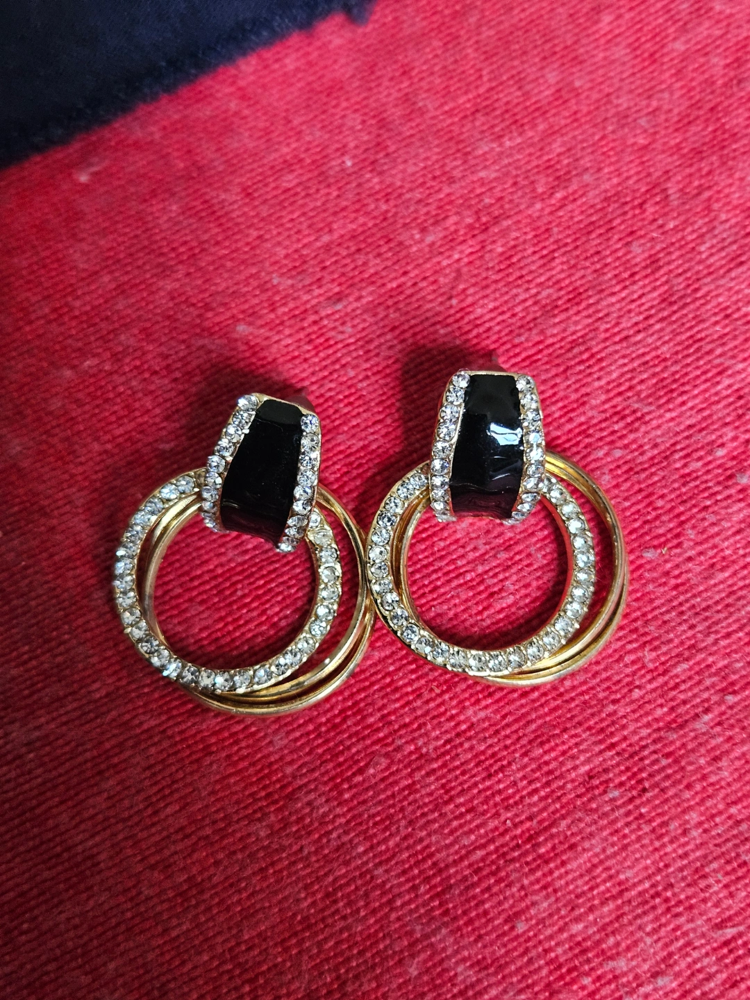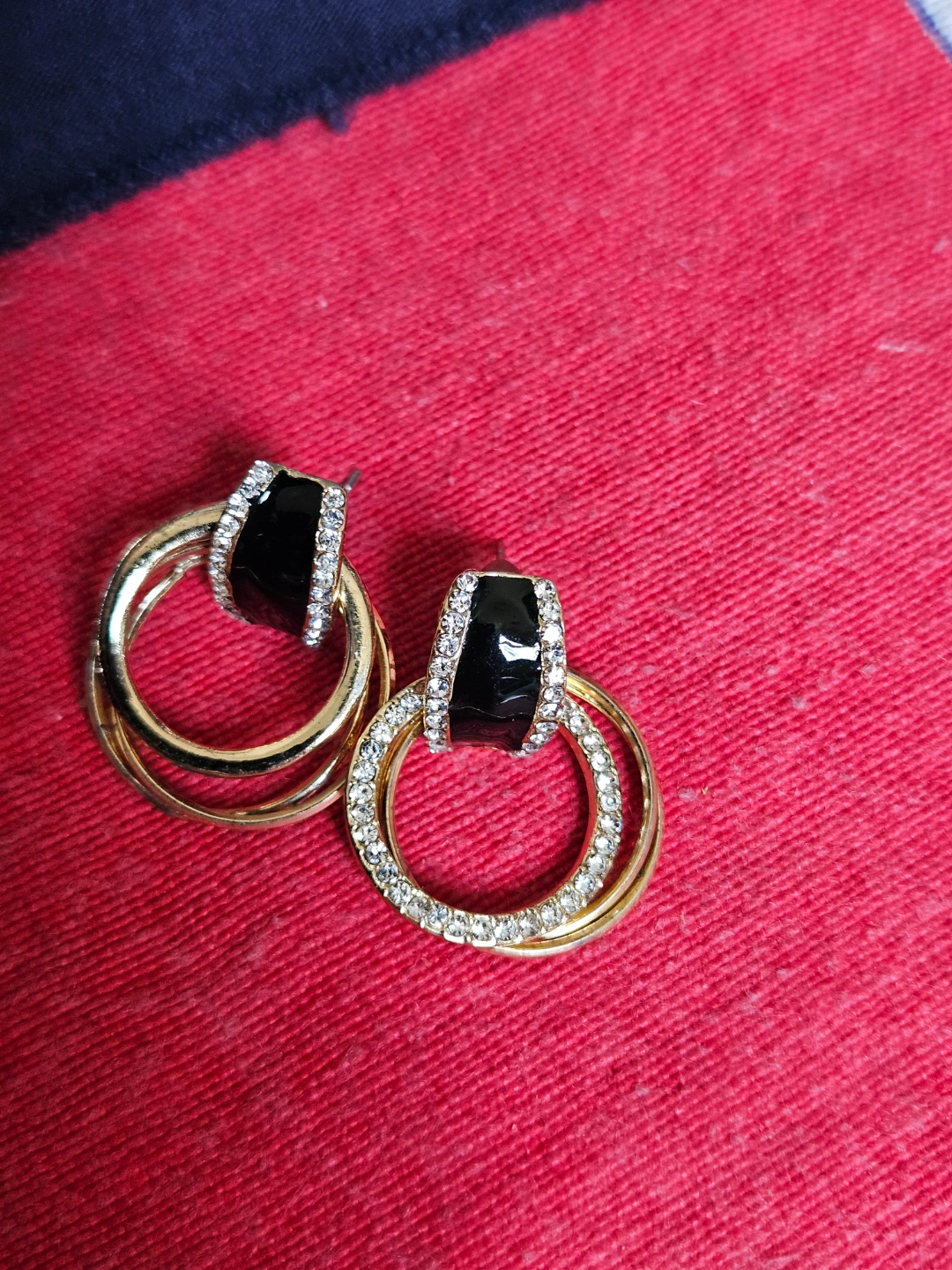 Beautiful gold-tone earrings. Features black enamel accents and clear cubic zirconia stones. Double ring design. Perfect for adding a touch of sparkle to any outfit.