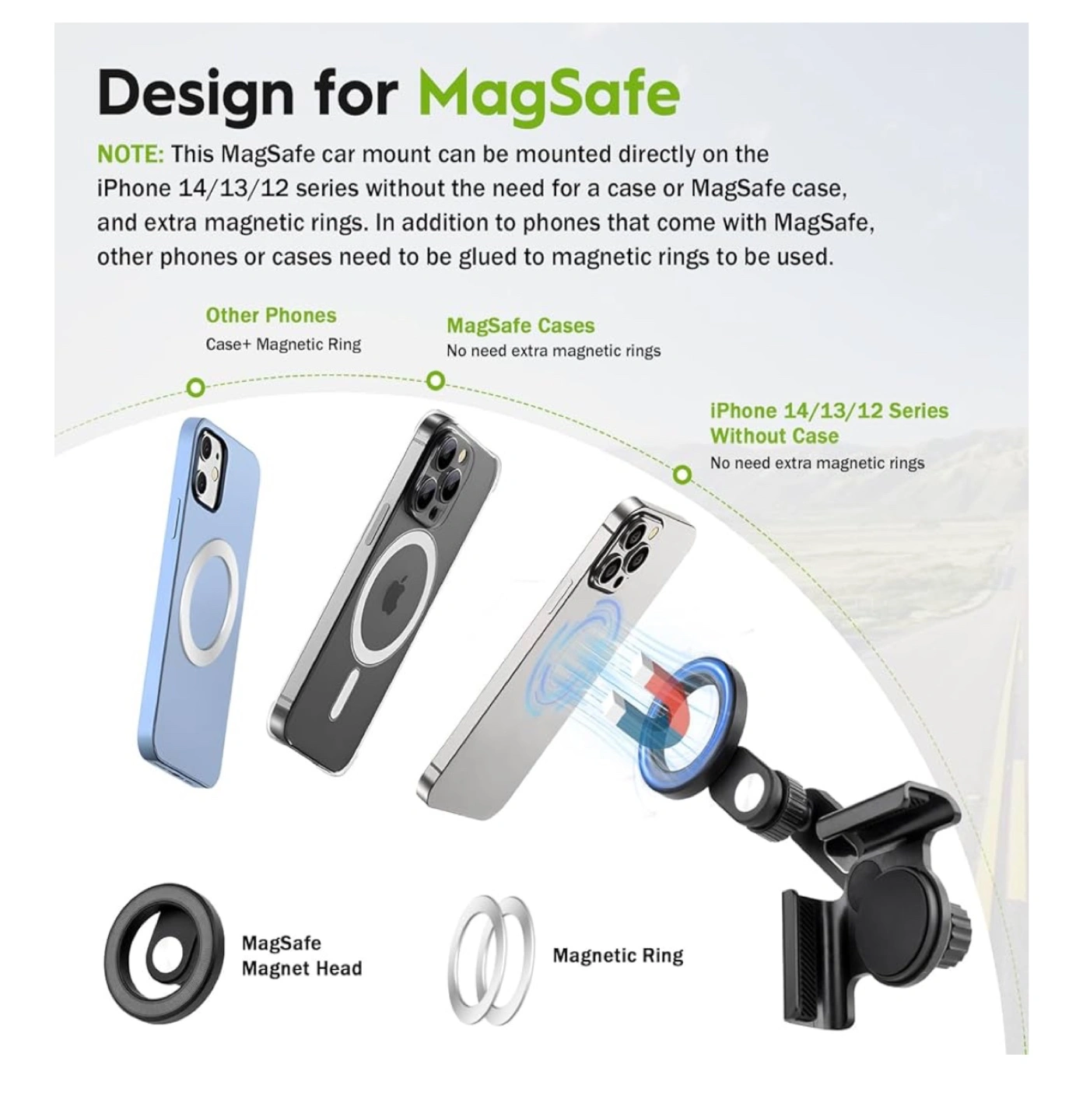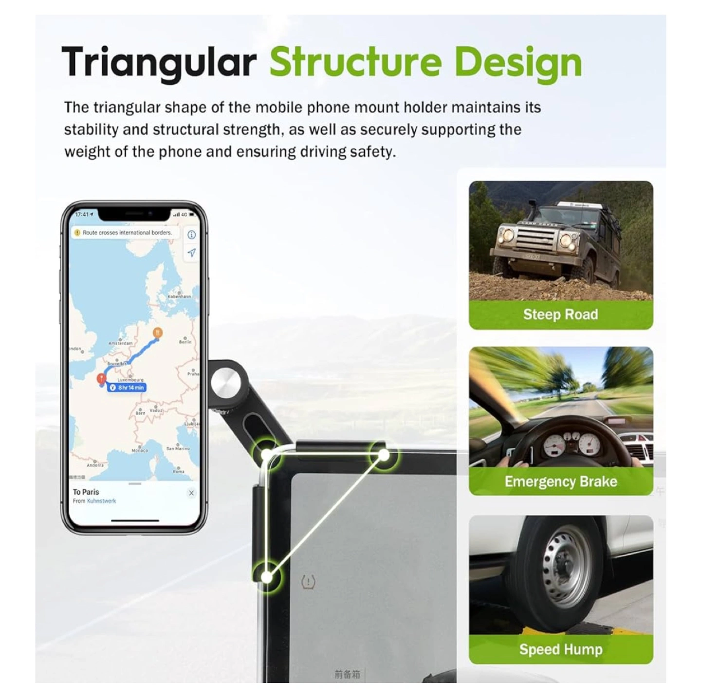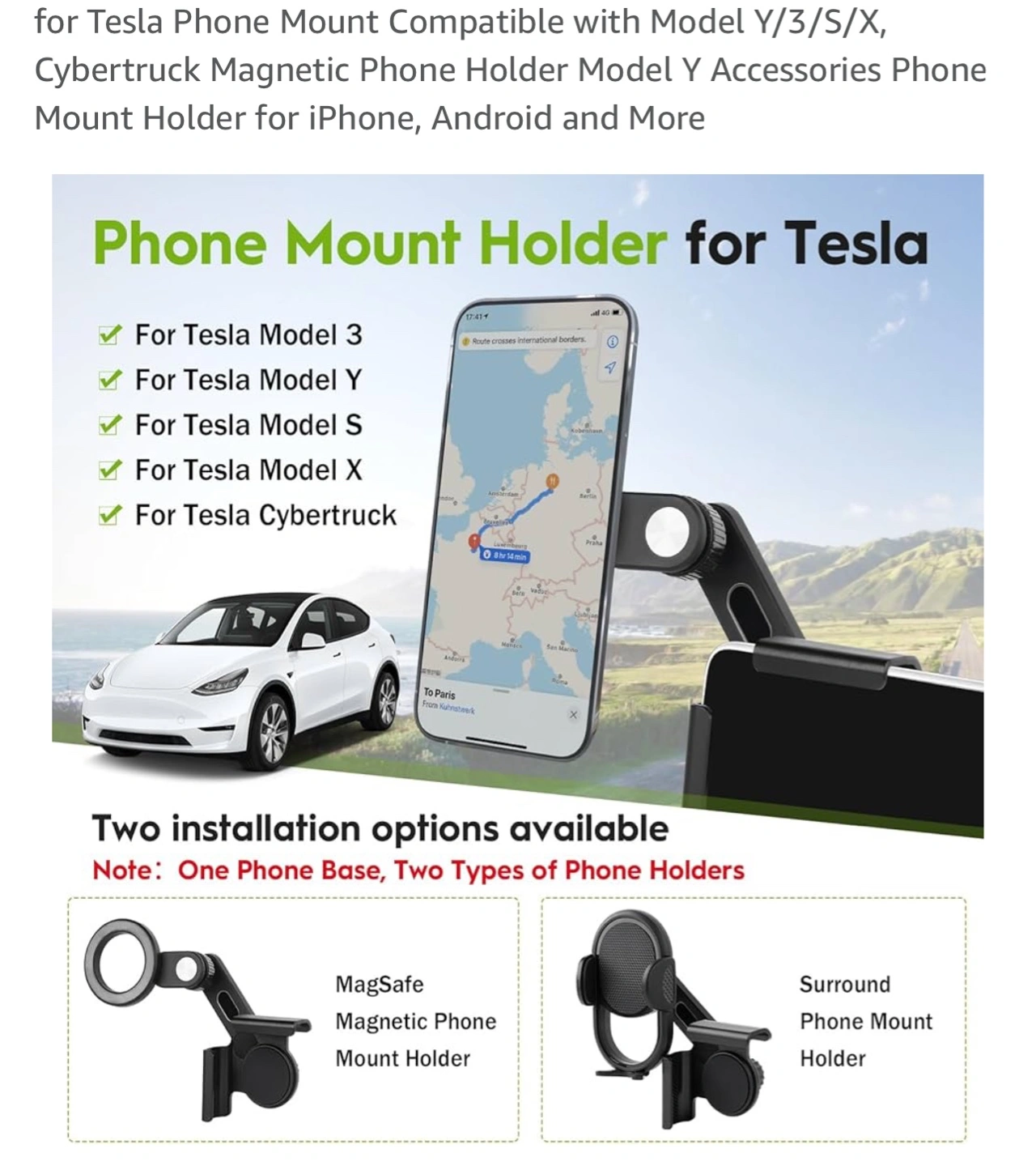Phone mount compatible with Tesla Model 3, Y, S, X, and Cybertruck. MagSafe compatible. 360° rotatable. Multiple mounting options. Secure and stable design. Easy installation.