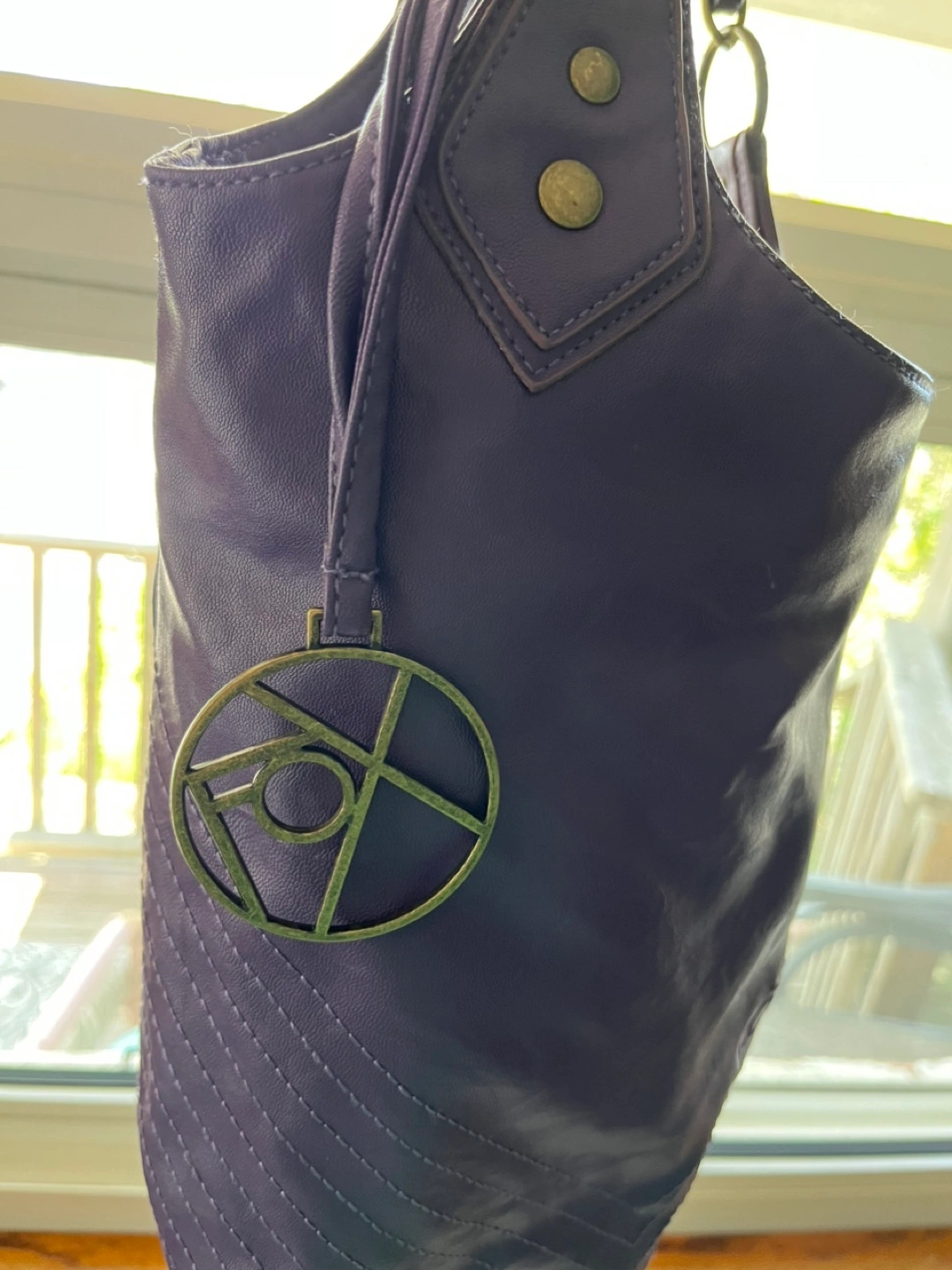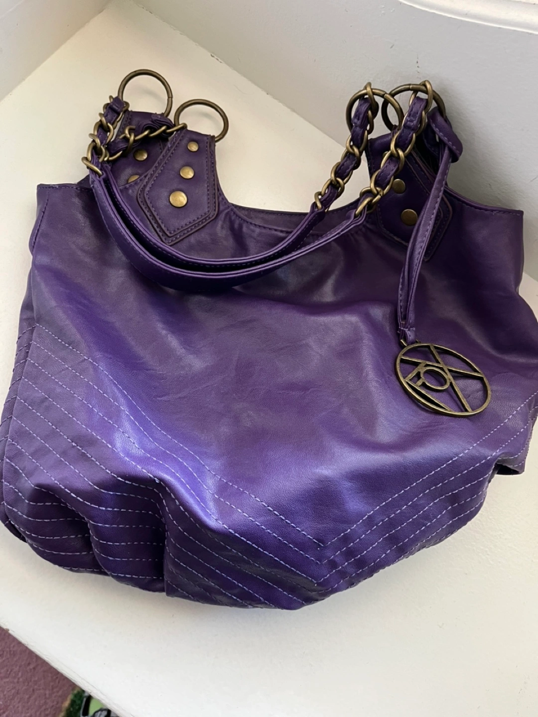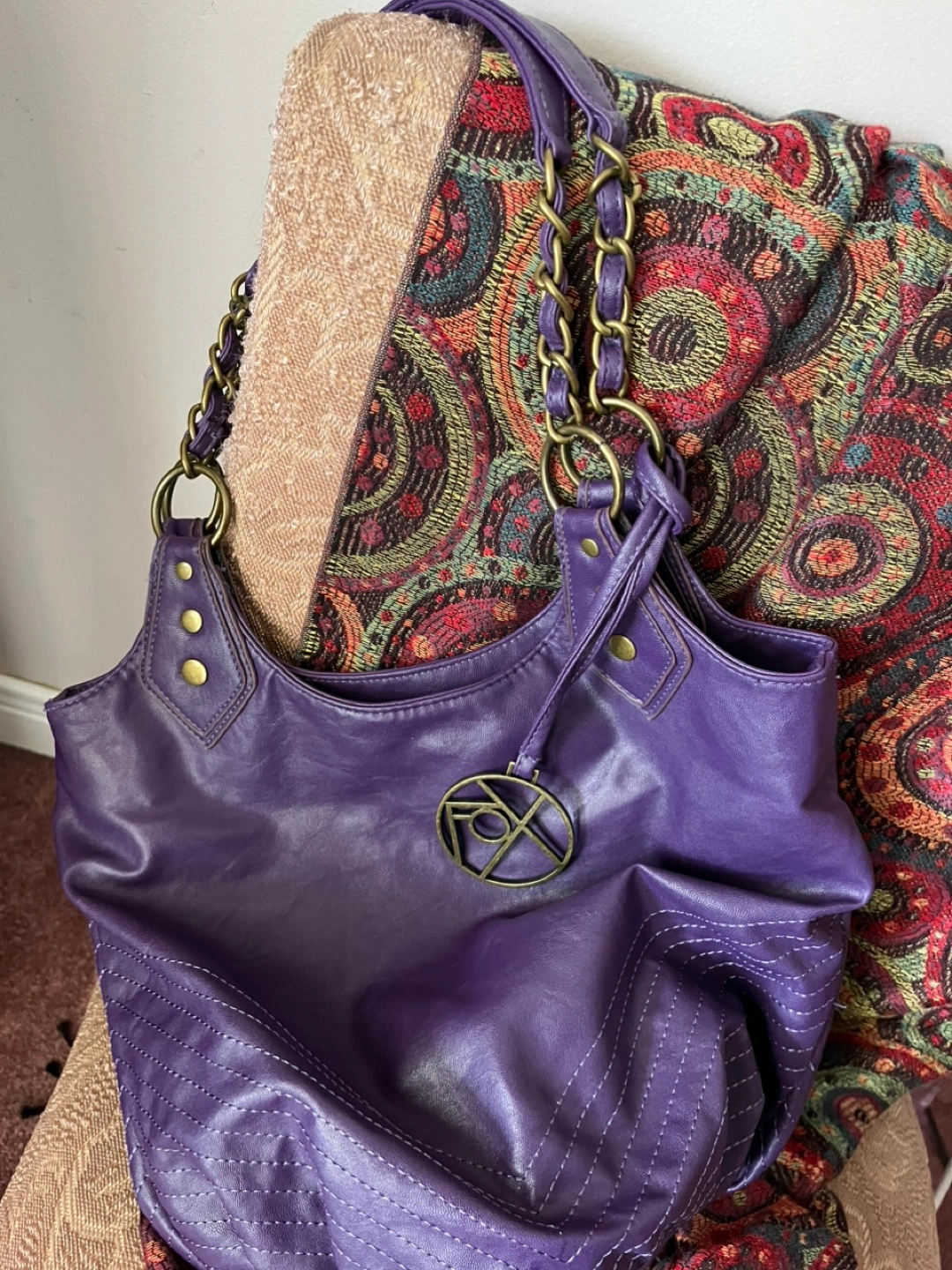 Beautifully soft and bright, medium sized, purple handbag. Features a chain strap and decorative stitching. Metal Fox logo detail. Great condition.