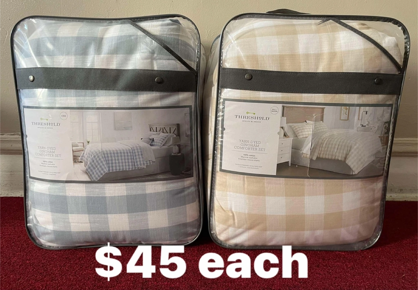 Two Threshold comforter sets available. One set features faux fur in cream and grey. The other set is yarn dyed in light blue and beige. King and Full/Queen sizes available. Machine washable.