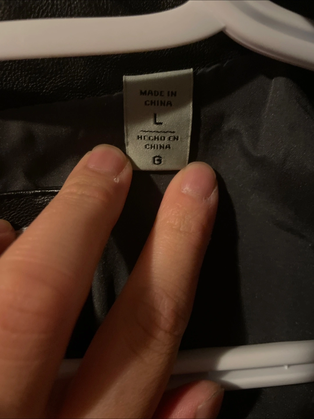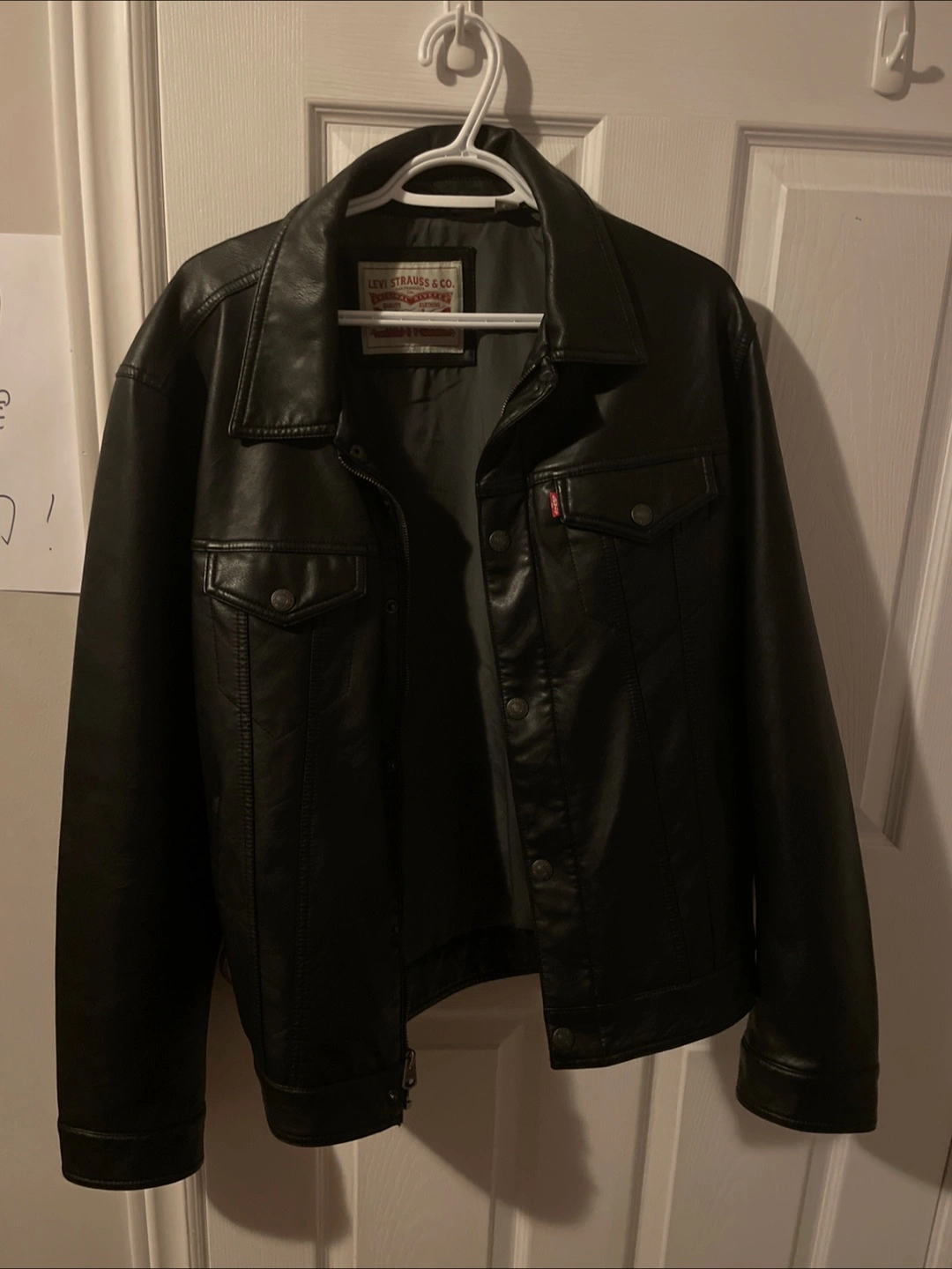1000+Black faux leather Levi's trucker jacket. Size large. Made in China. Classic style, button closure. Excellent condition.