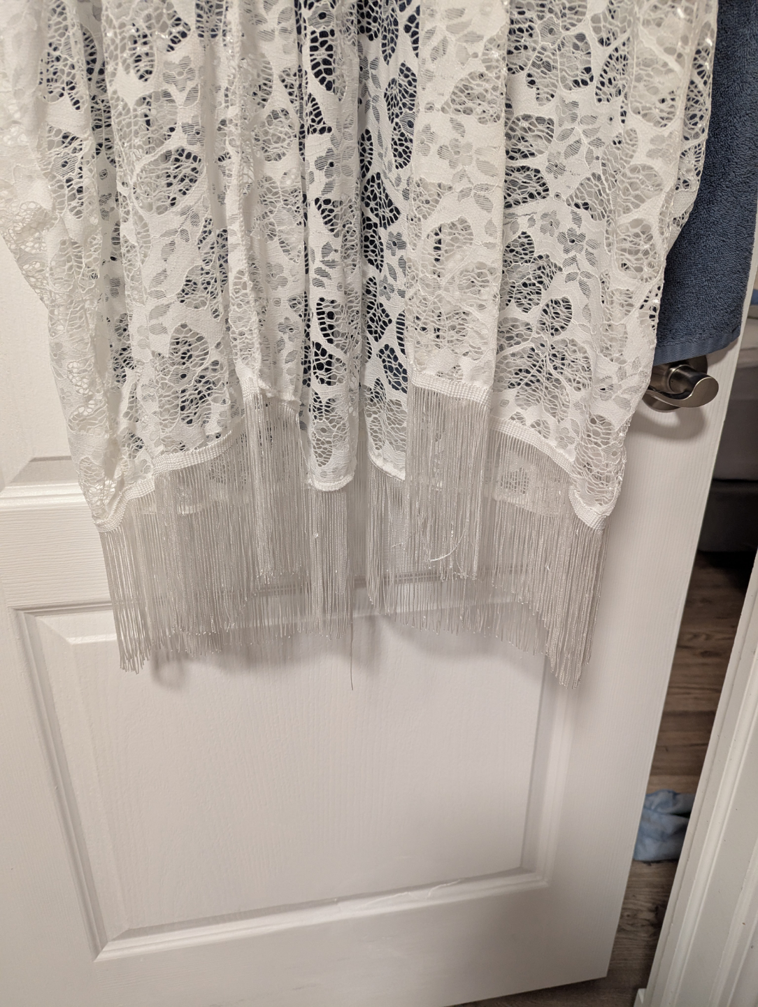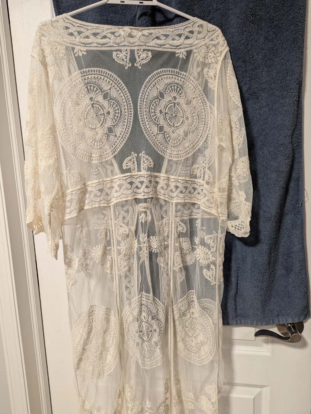 Beautiful white lace kimono. Features a delicate floral pattern and a fringed hem. Open front, three-quarter sleeves. Sheer and lightweight, perfect for layering.