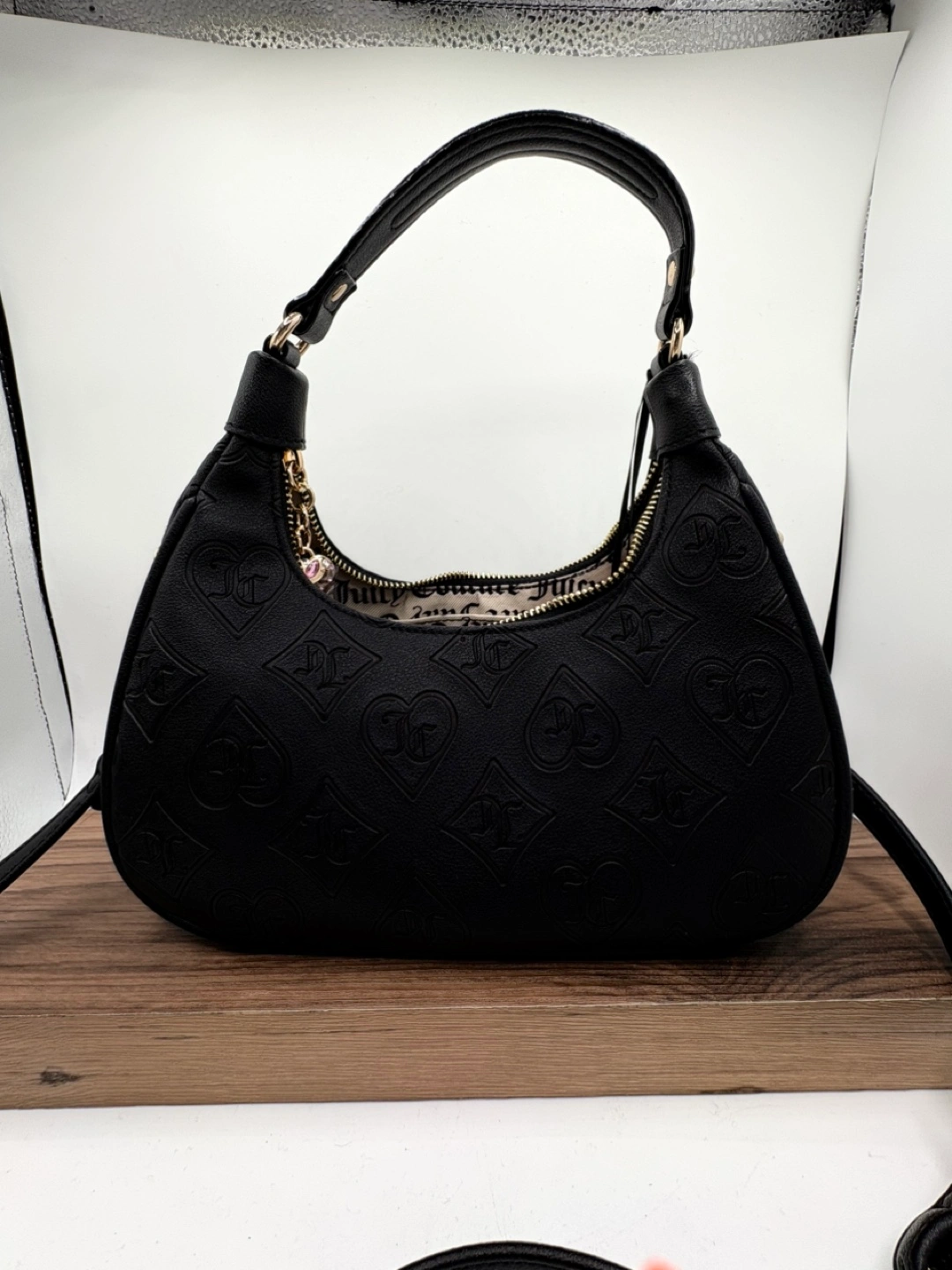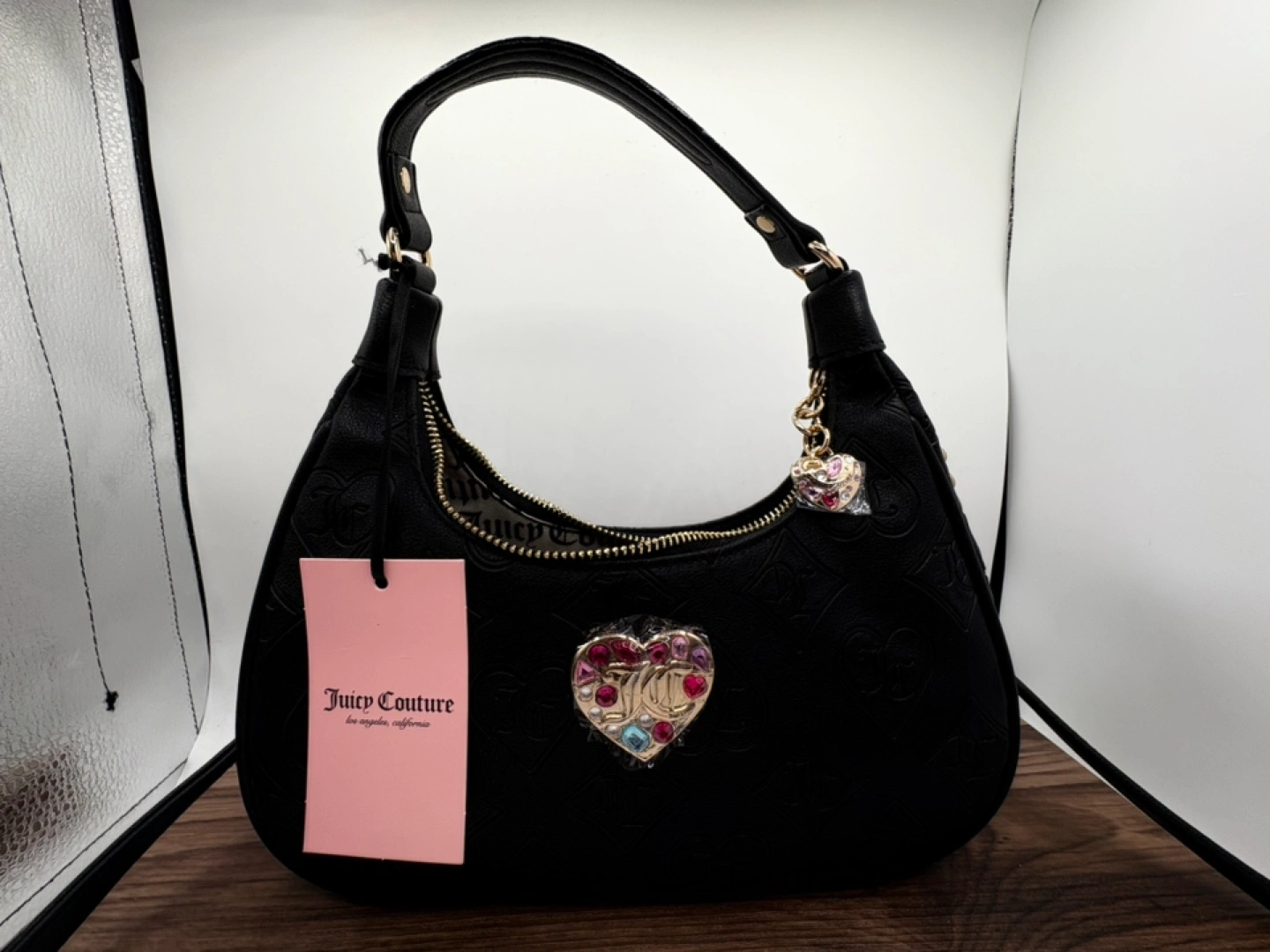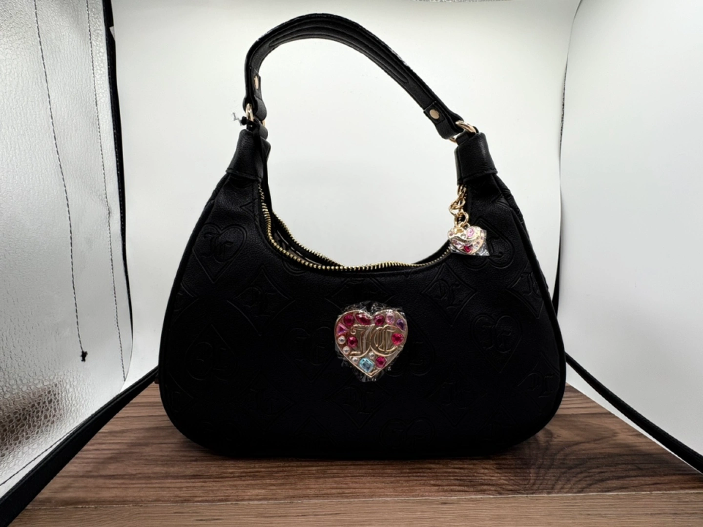 Black handbag. Embossed logo. Top handle and detachable strap. Heart-shaped charm. Zipper closure.