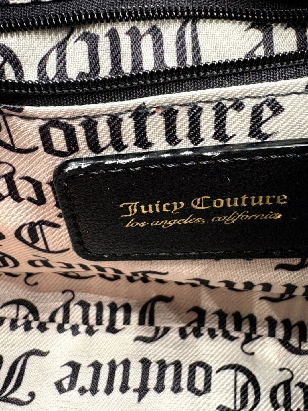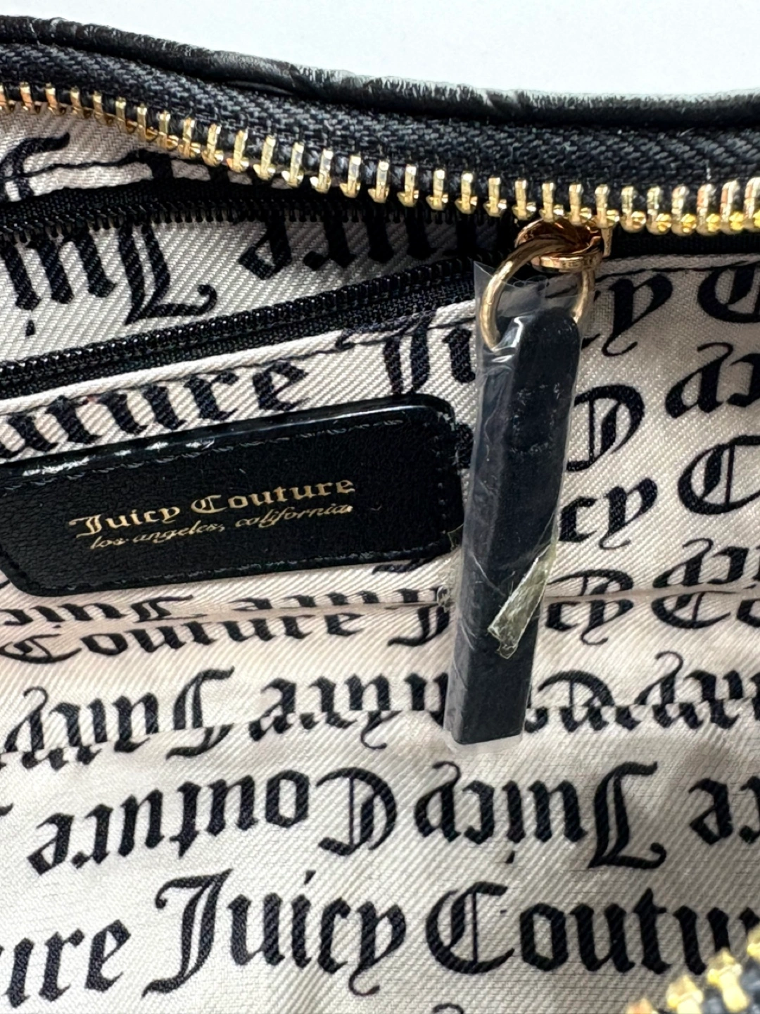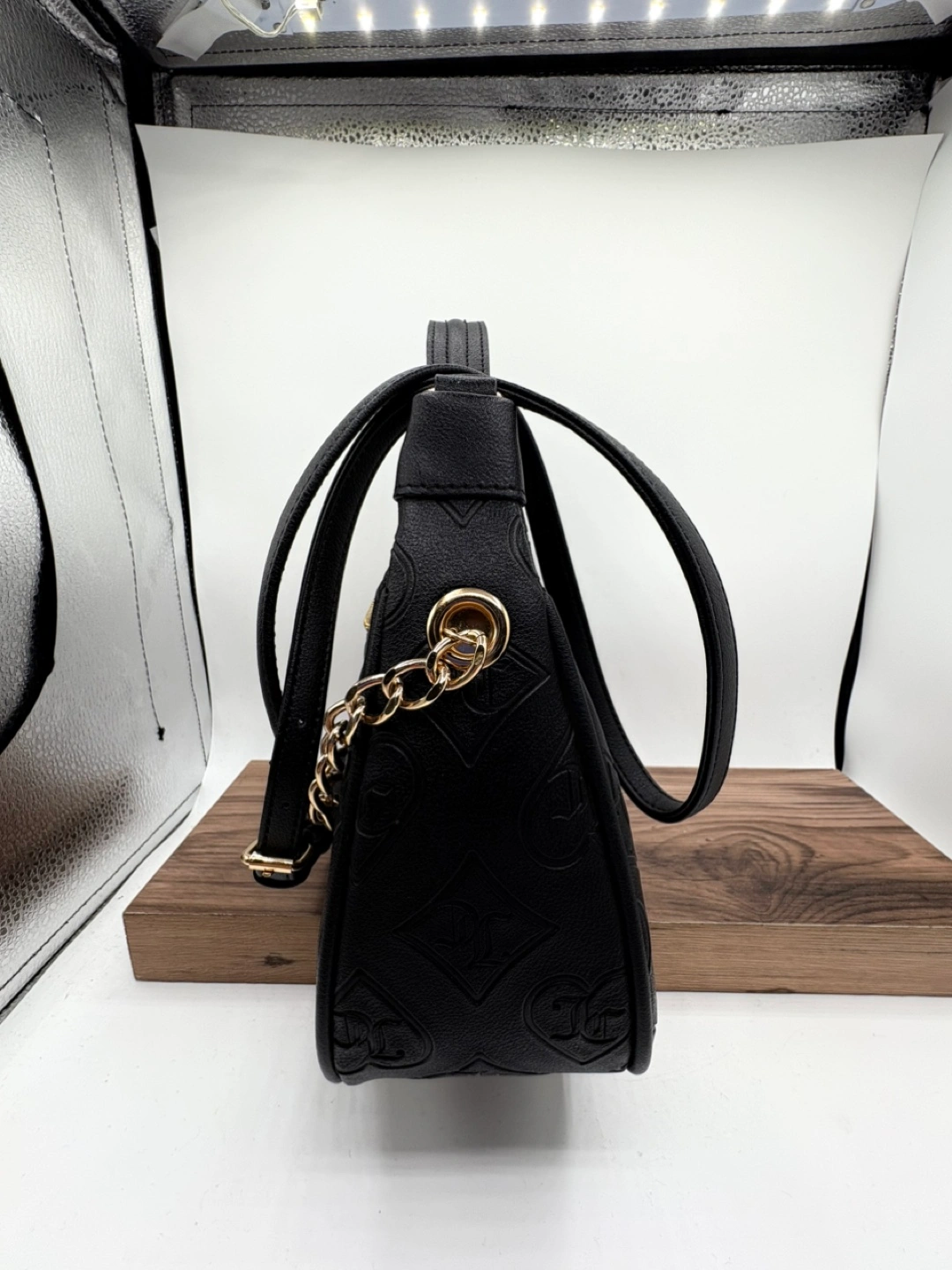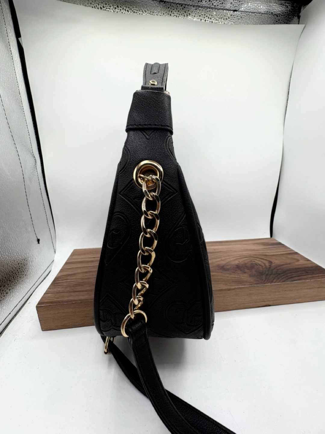 Black handbag. Embossed logo. Top handle and detachable strap. Heart-shaped charm. Zipper closure.
