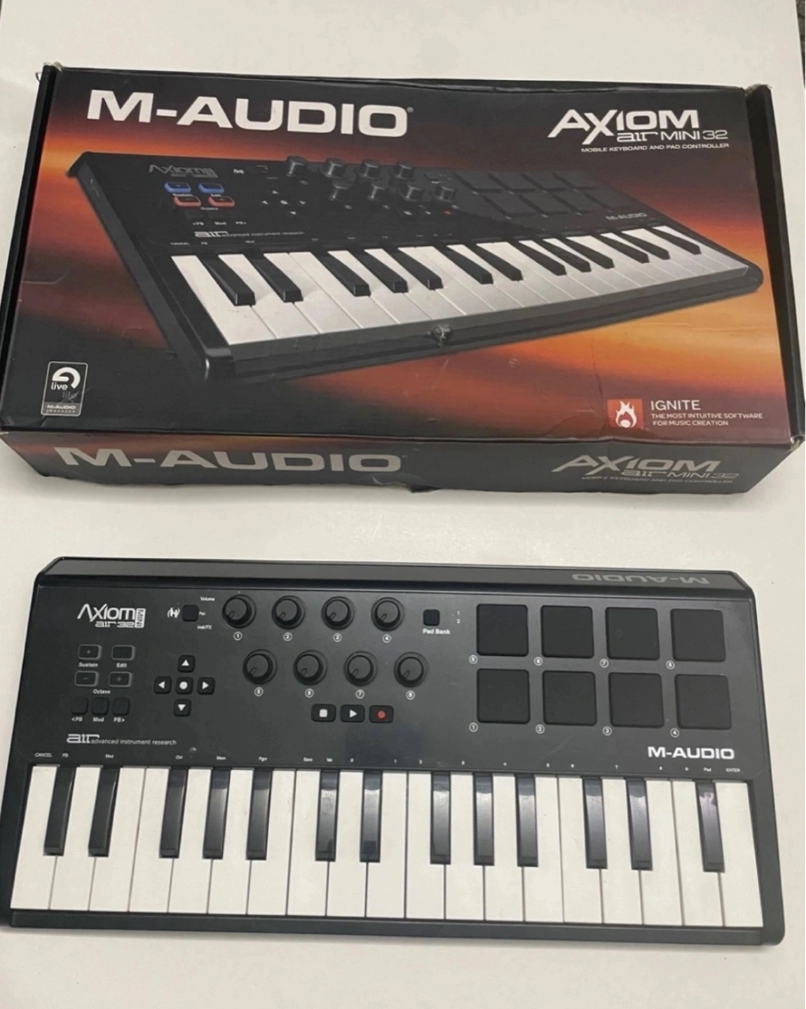 USB keyboard controller. Includes box and USB cable. Mini keyboard with pads and knobs. Good for music production.