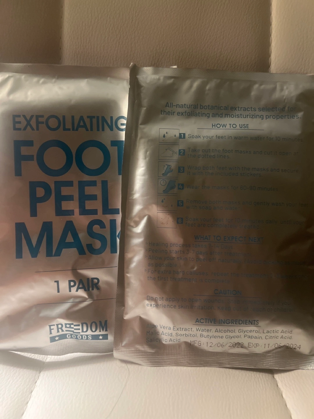 Exfoliating foot peel mask. One pair included. All-natural botanical extracts. Soak feet, wrap with masks, and wear for 60-90 minutes. Peeling starts 3-7 days after treatment. Expect 7-14 days healing process.