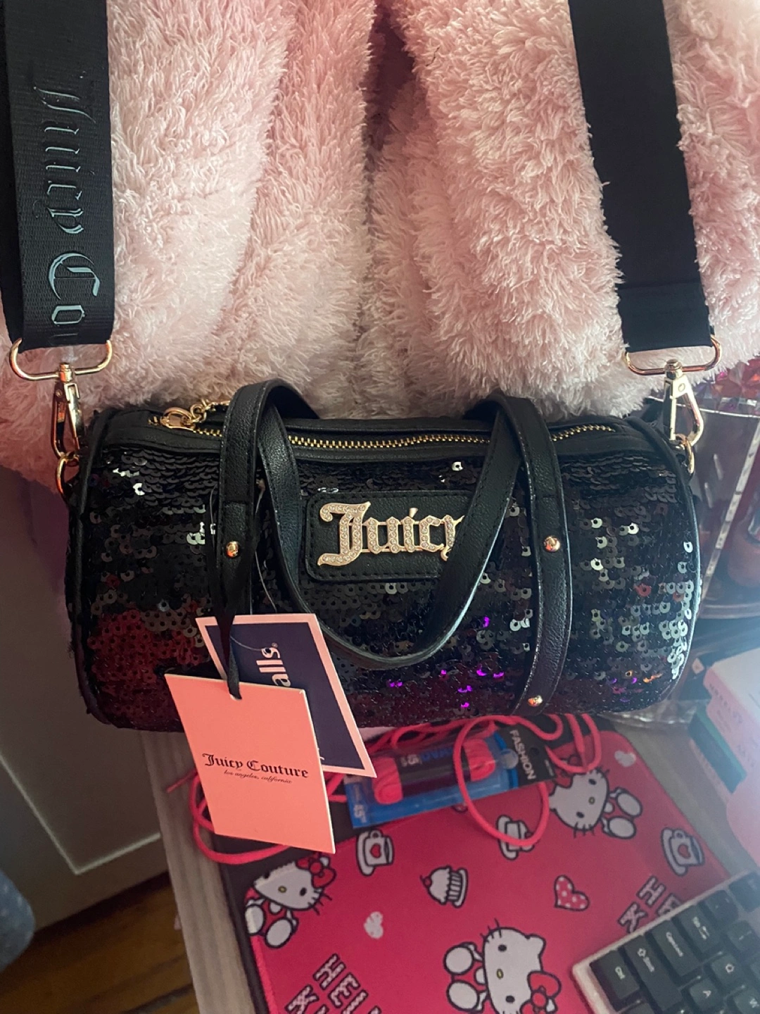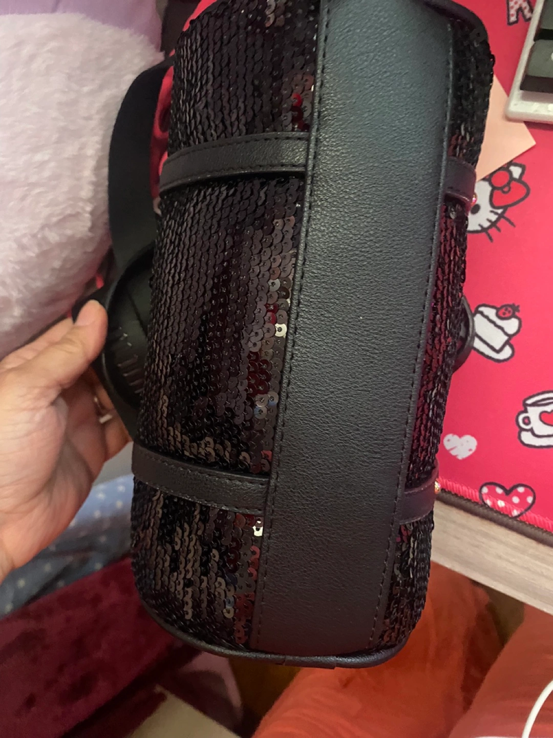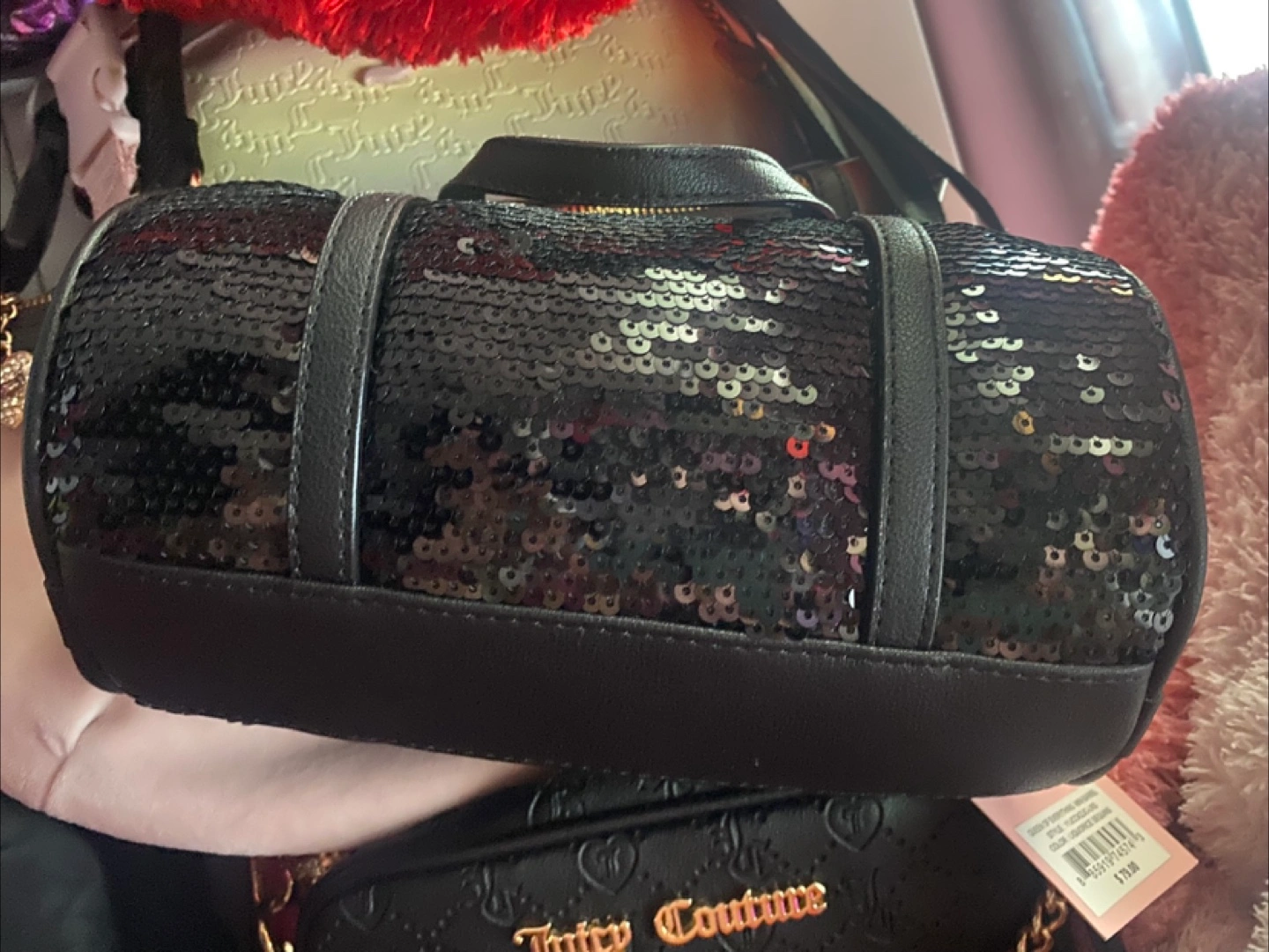 Mini barrel bag. Black sequins. Features top handles and a detachable crossbody strap. Gold hardware. New with tag.