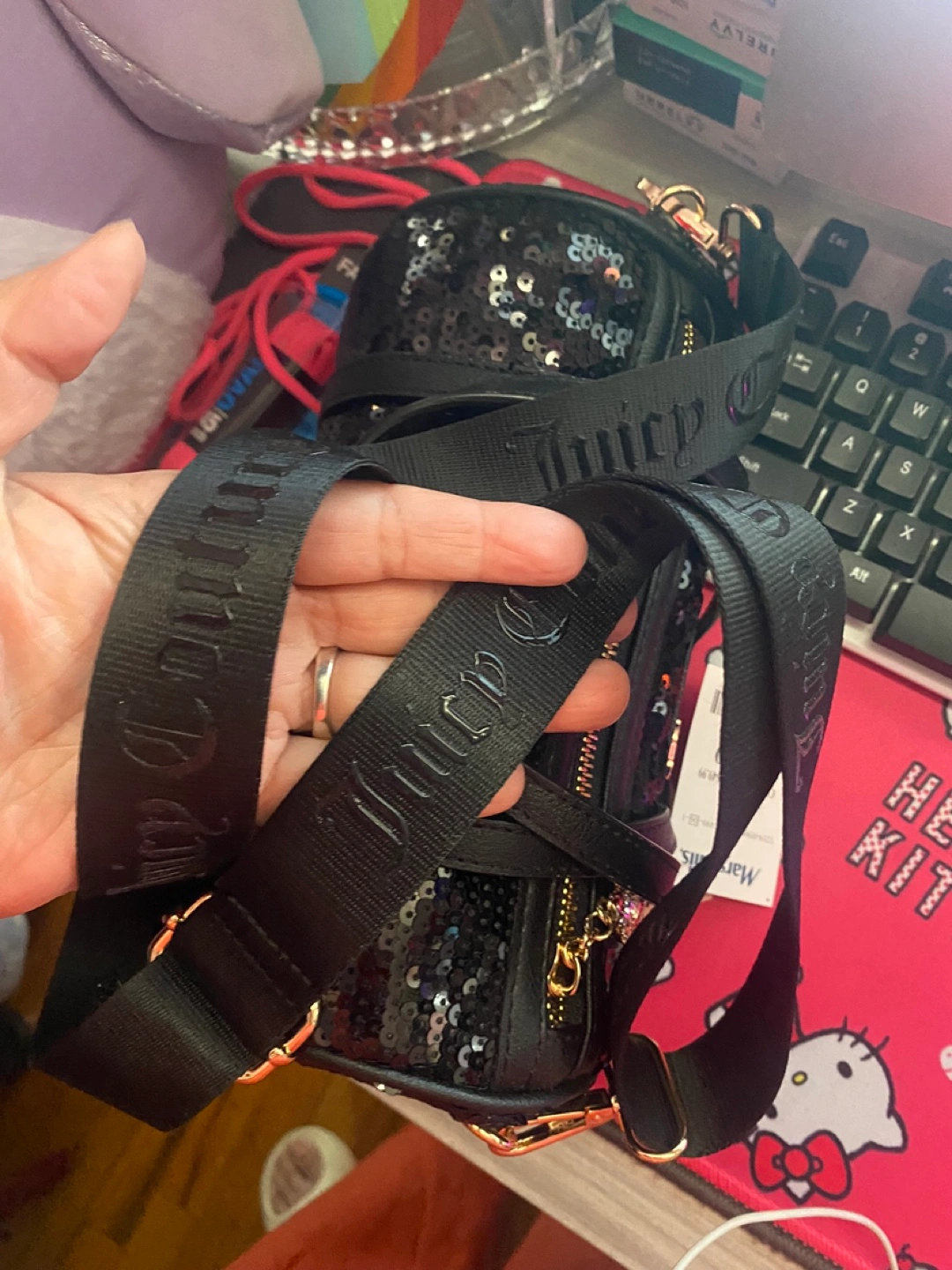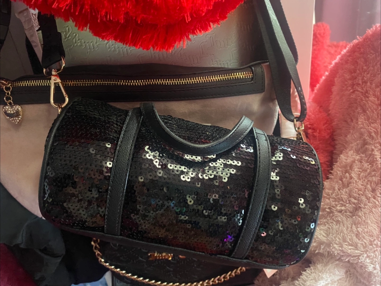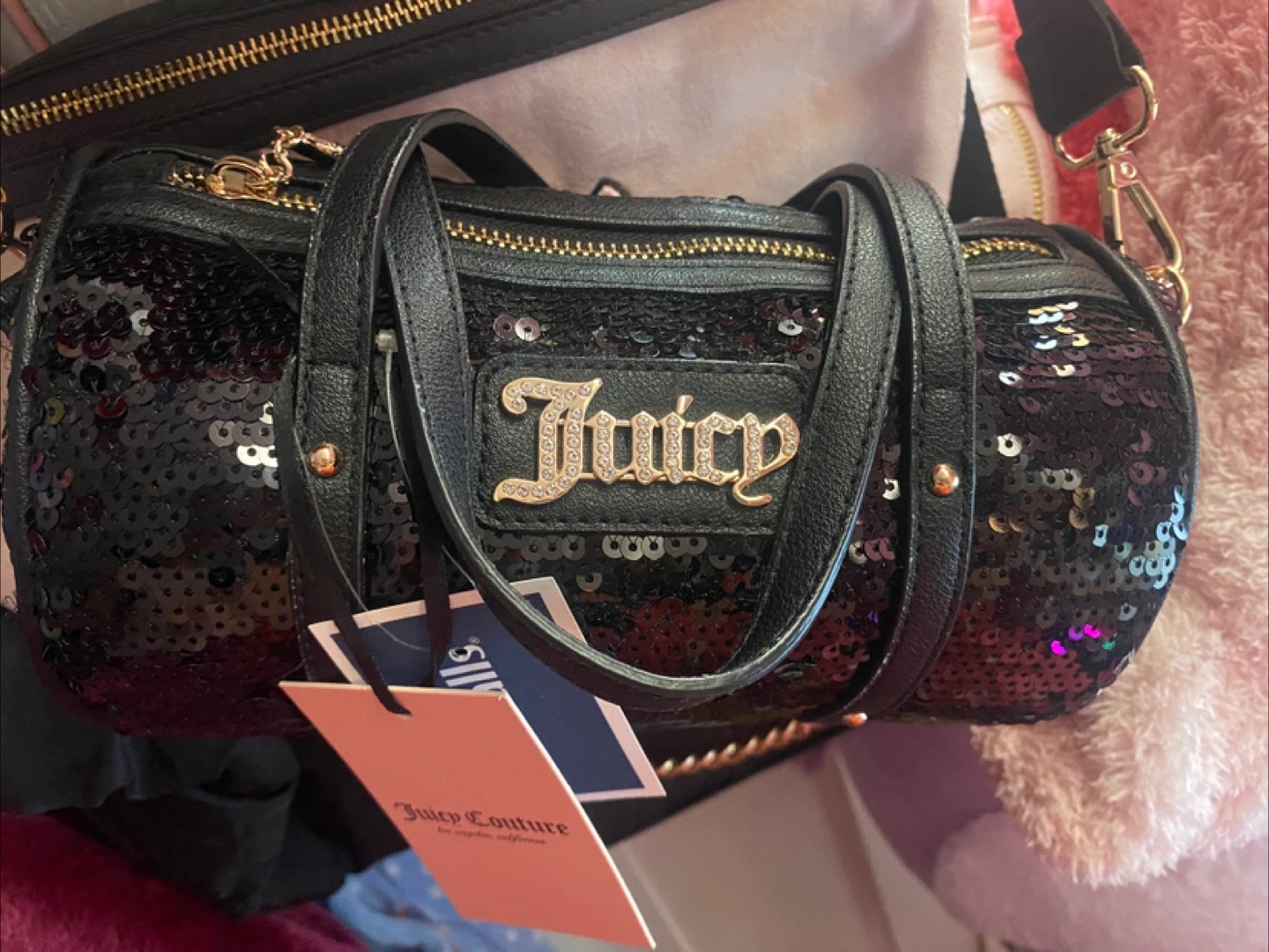 Mini barrel bag. Black sequins. Features top handles and a detachable crossbody strap. Gold hardware. New with tag.