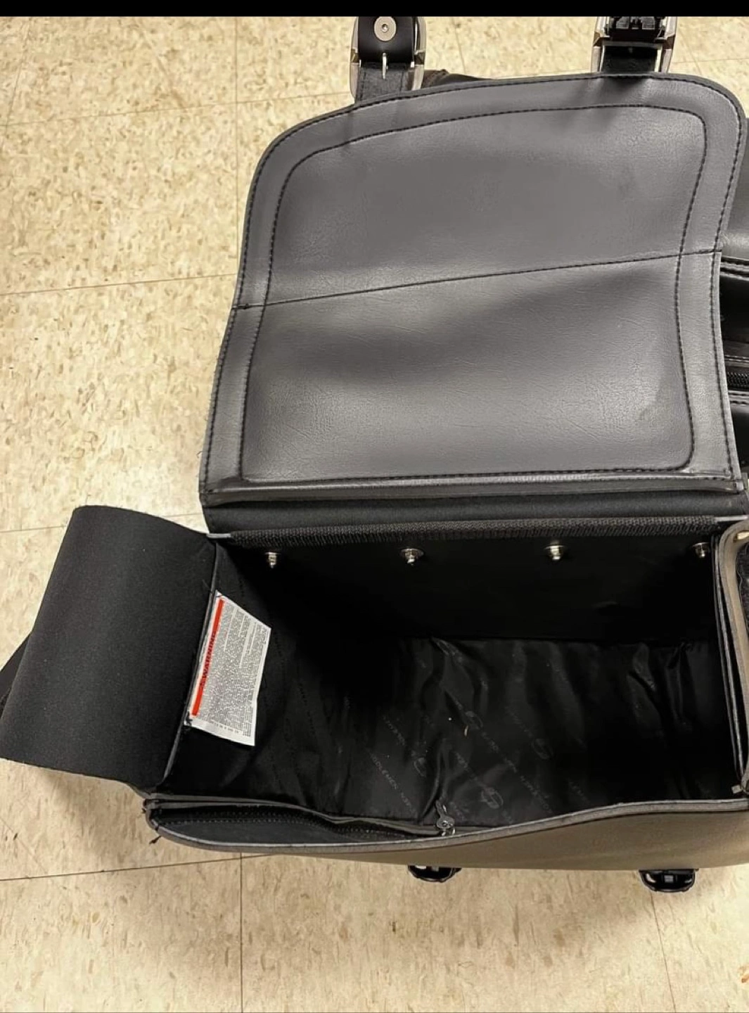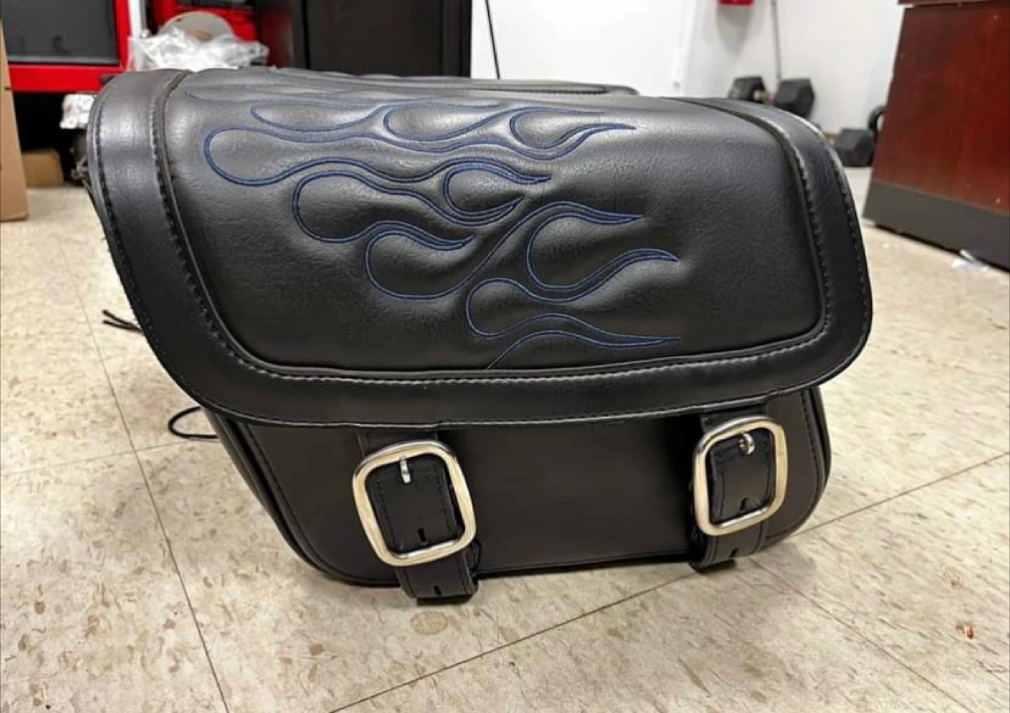 Pair of black leather saddlebags. Flames design. Metal buckles. Zippered compartments. Great for motorcycles. Brand New Never Used