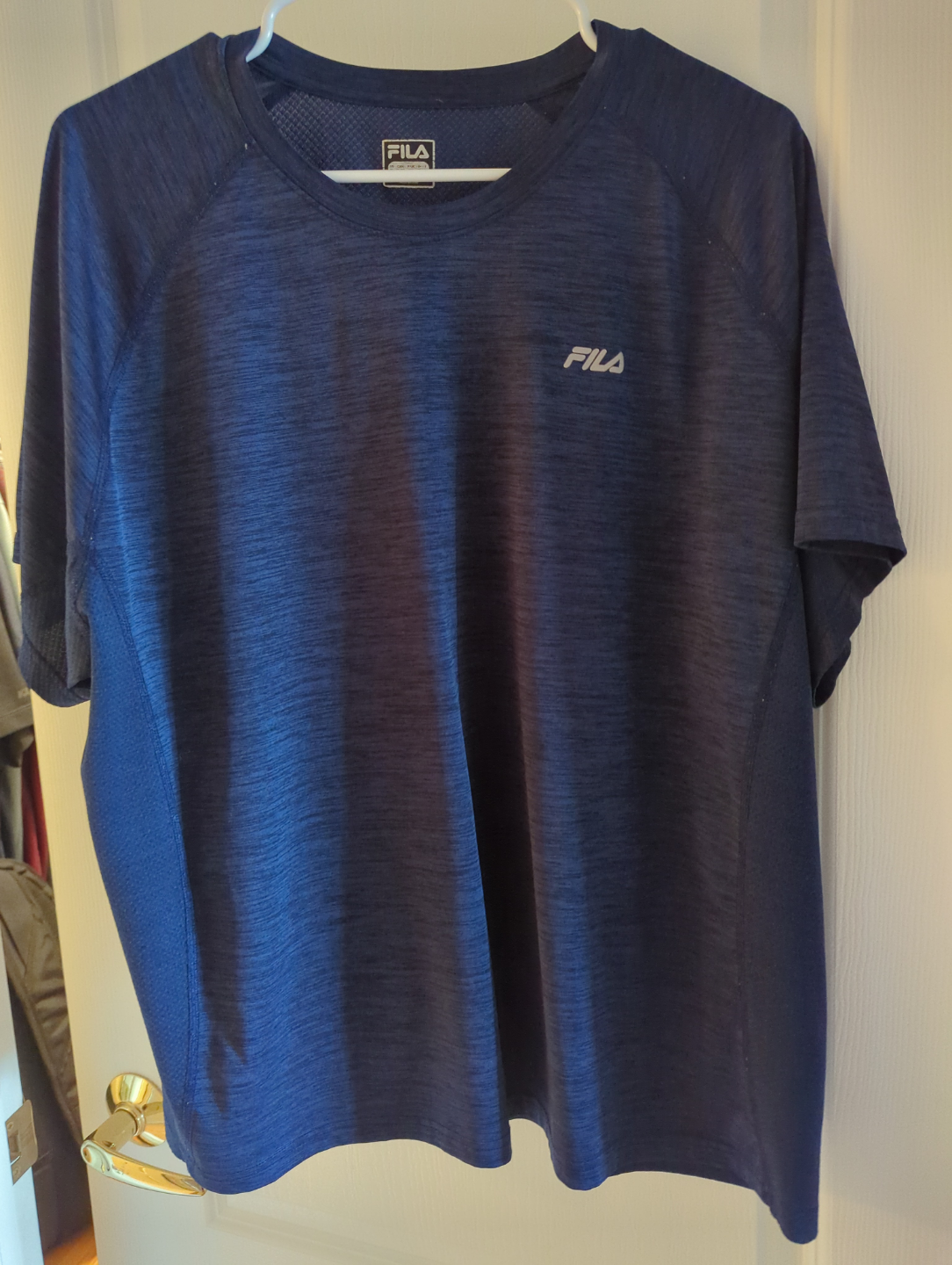 Dark blue performance t-shirt. Short sleeves. Moisture-wicking fabric. Great for workouts or casual wear.