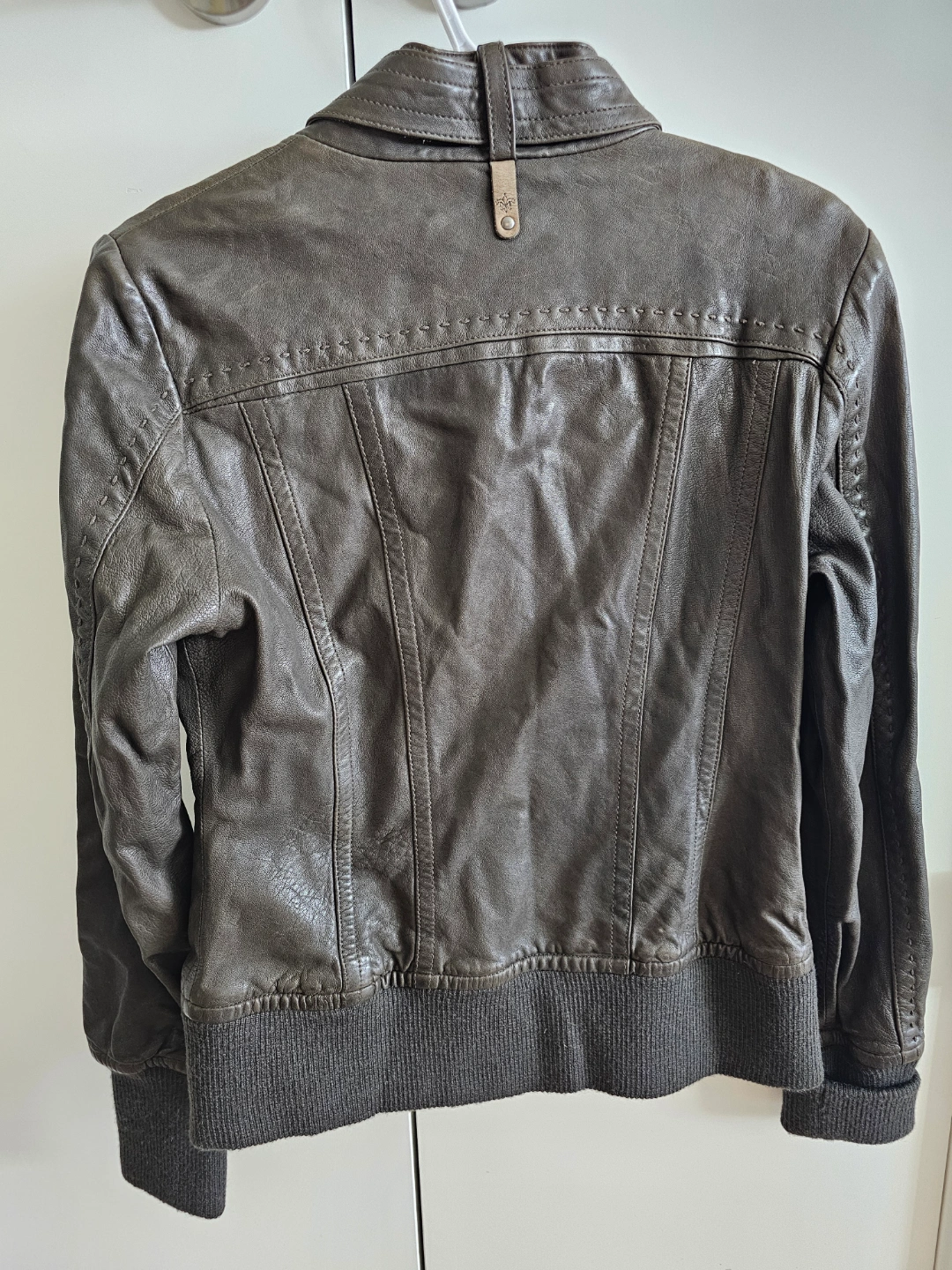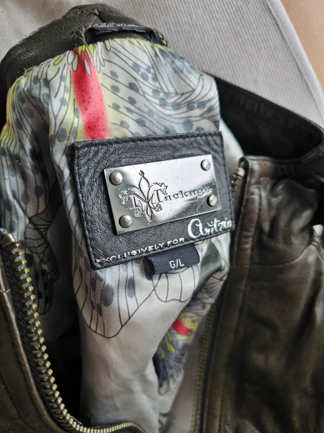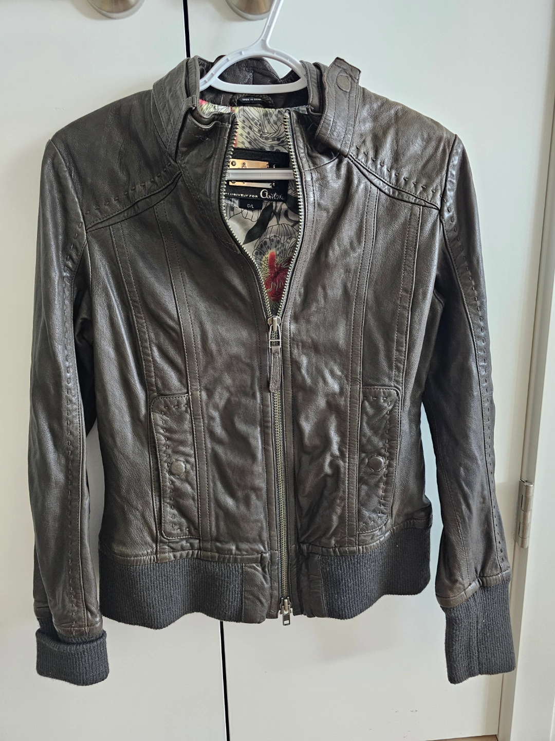 Women's brown leather jacket. Size G/L. Features a zip closure, ribbed cuffs and hem. Unique patterned interior lining. Excellent pre-owned condition.
