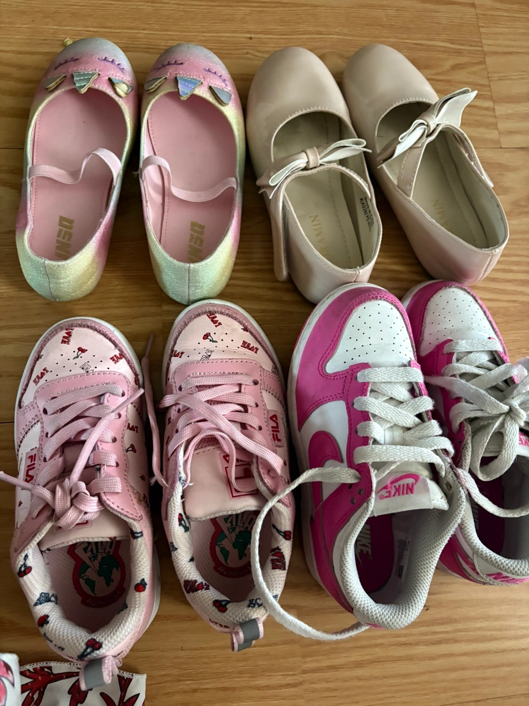 Bundle of girls' shoes, various sizes and styles. Includes Fila sneakers, Nike sneakers, and other pairs. Check images for details.