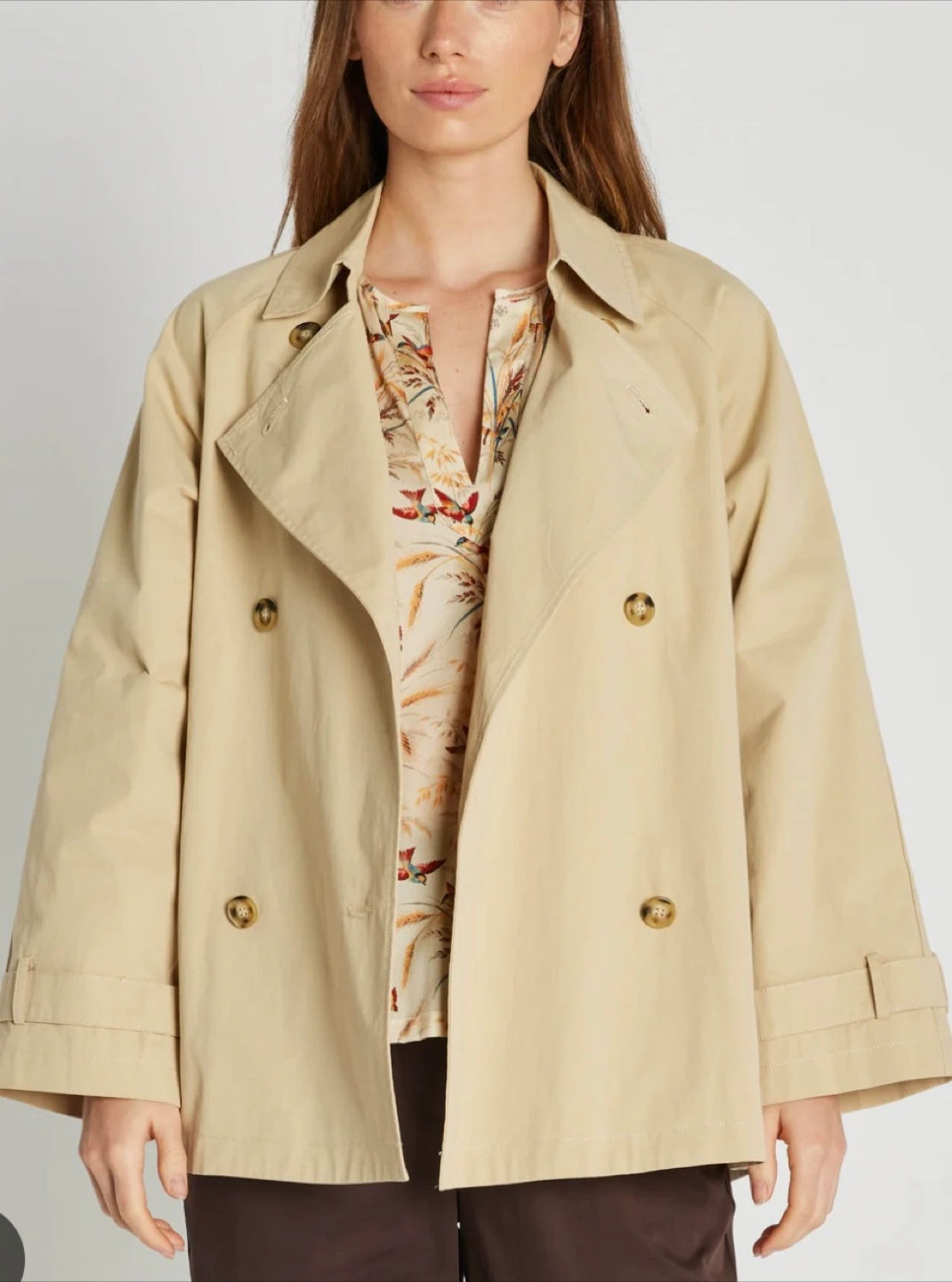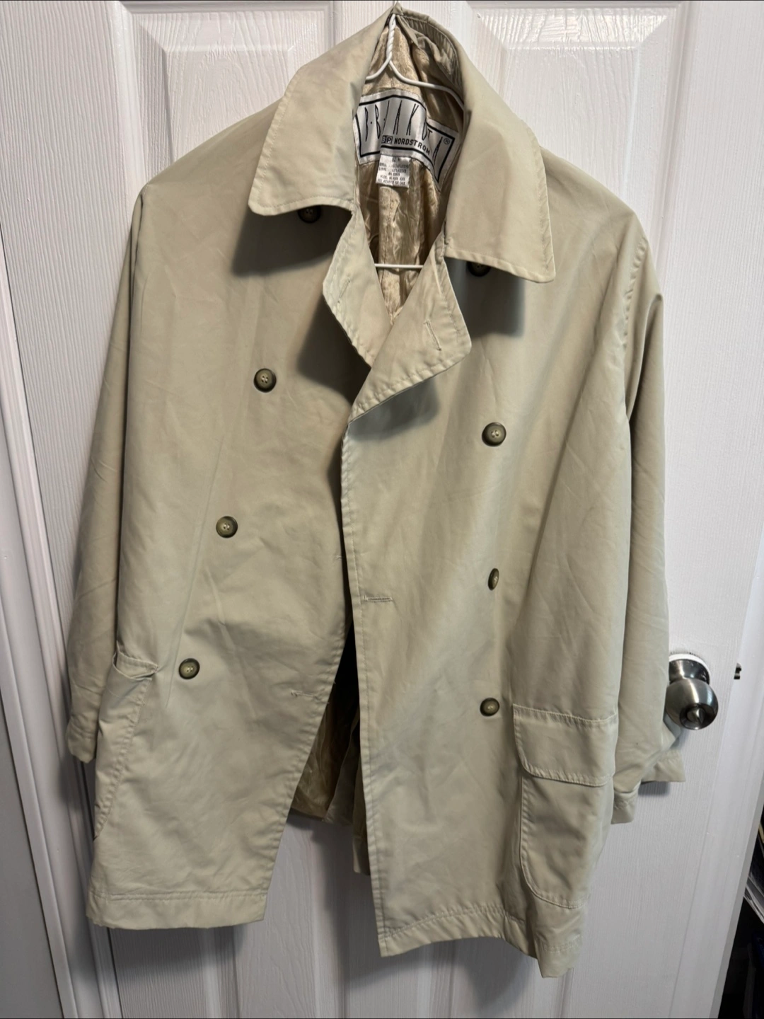 Beige double-breasted trench coat. Size medium. Features button closures and pockets. Relaxed fit.