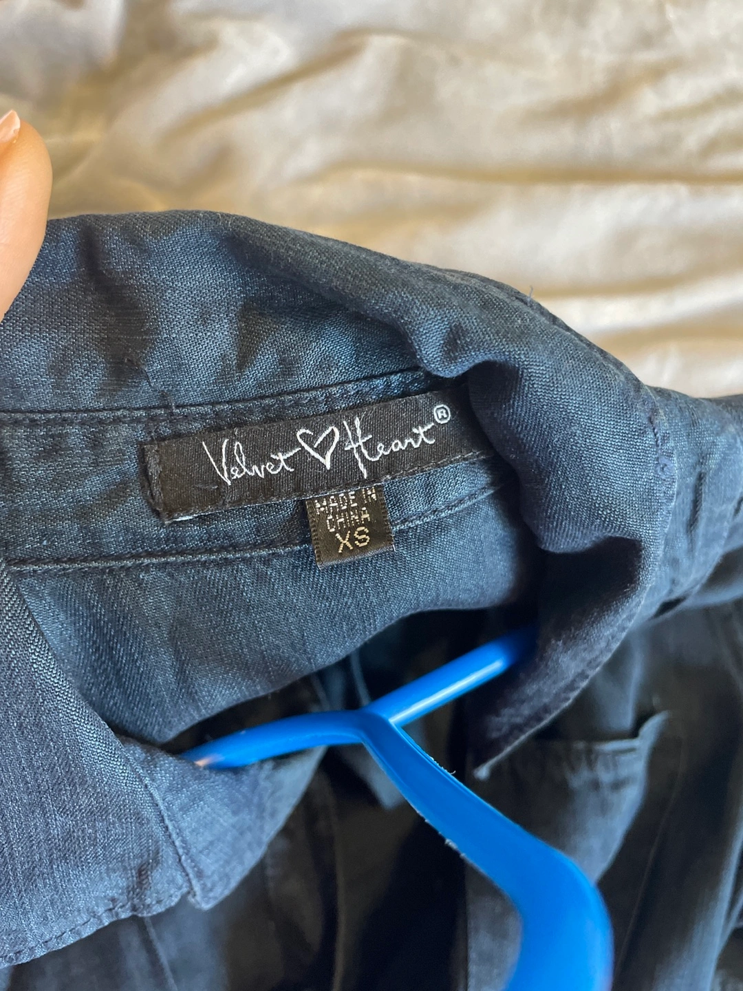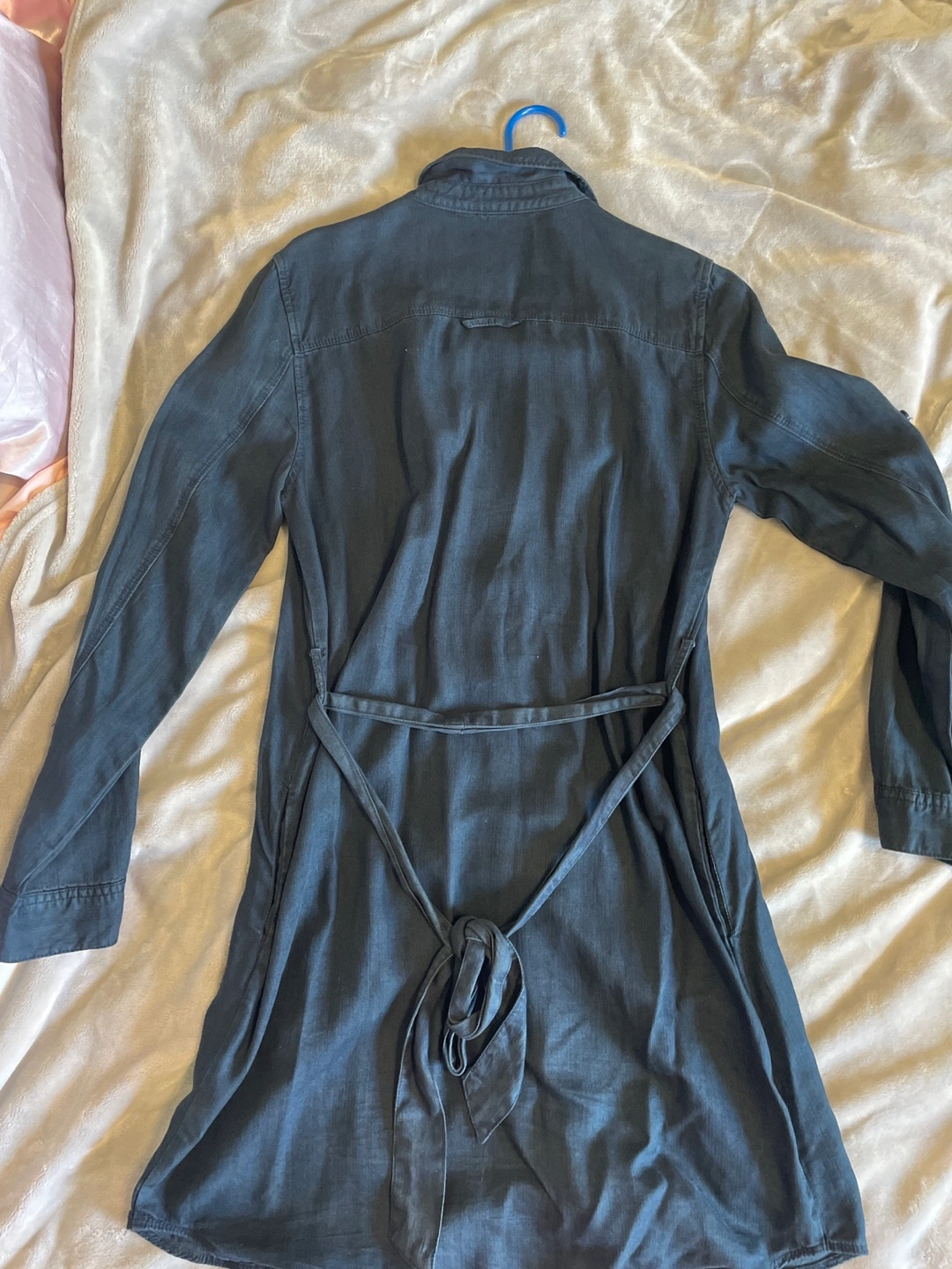 475Dark gray button-down shirt dress. Long sleeves, pockets, and tie belt. Size XS.