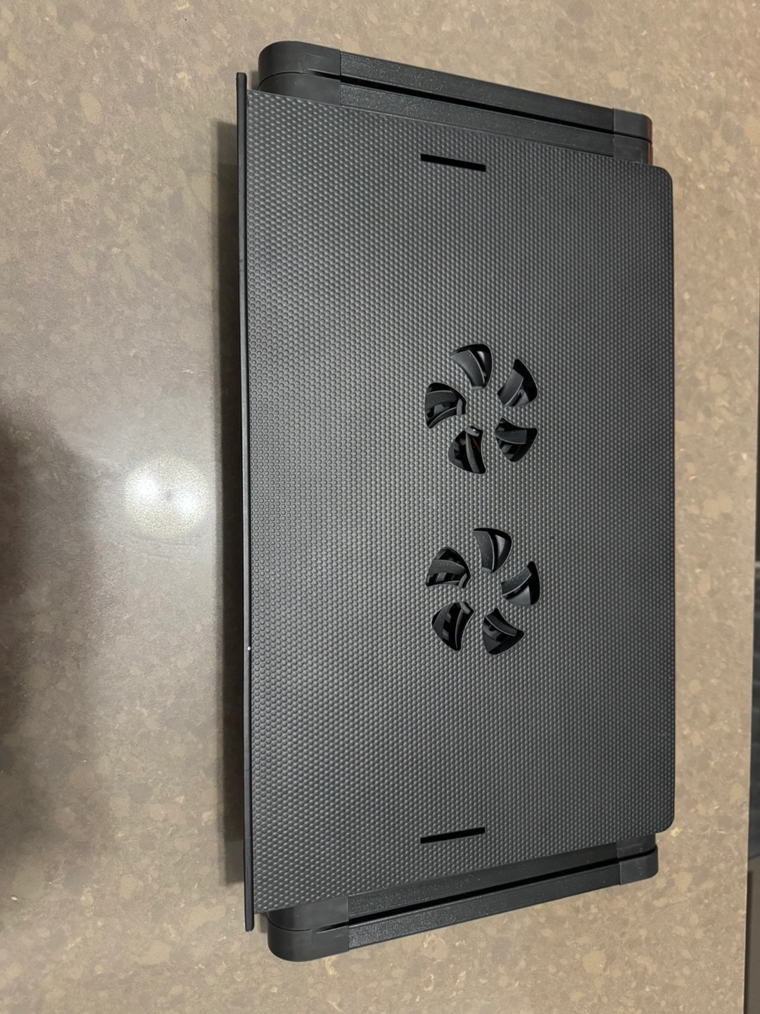 Changed my workspace setup and no longer need this. It’s quite big so can fit probably any laptop size. The legs are fully customizable in 3 ways so you can angle it however you may need it. $25