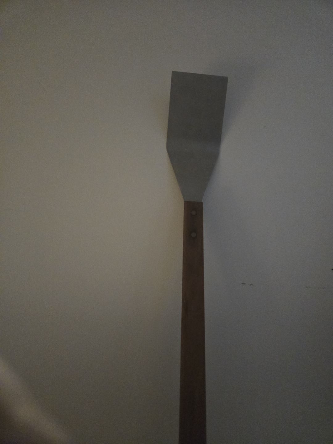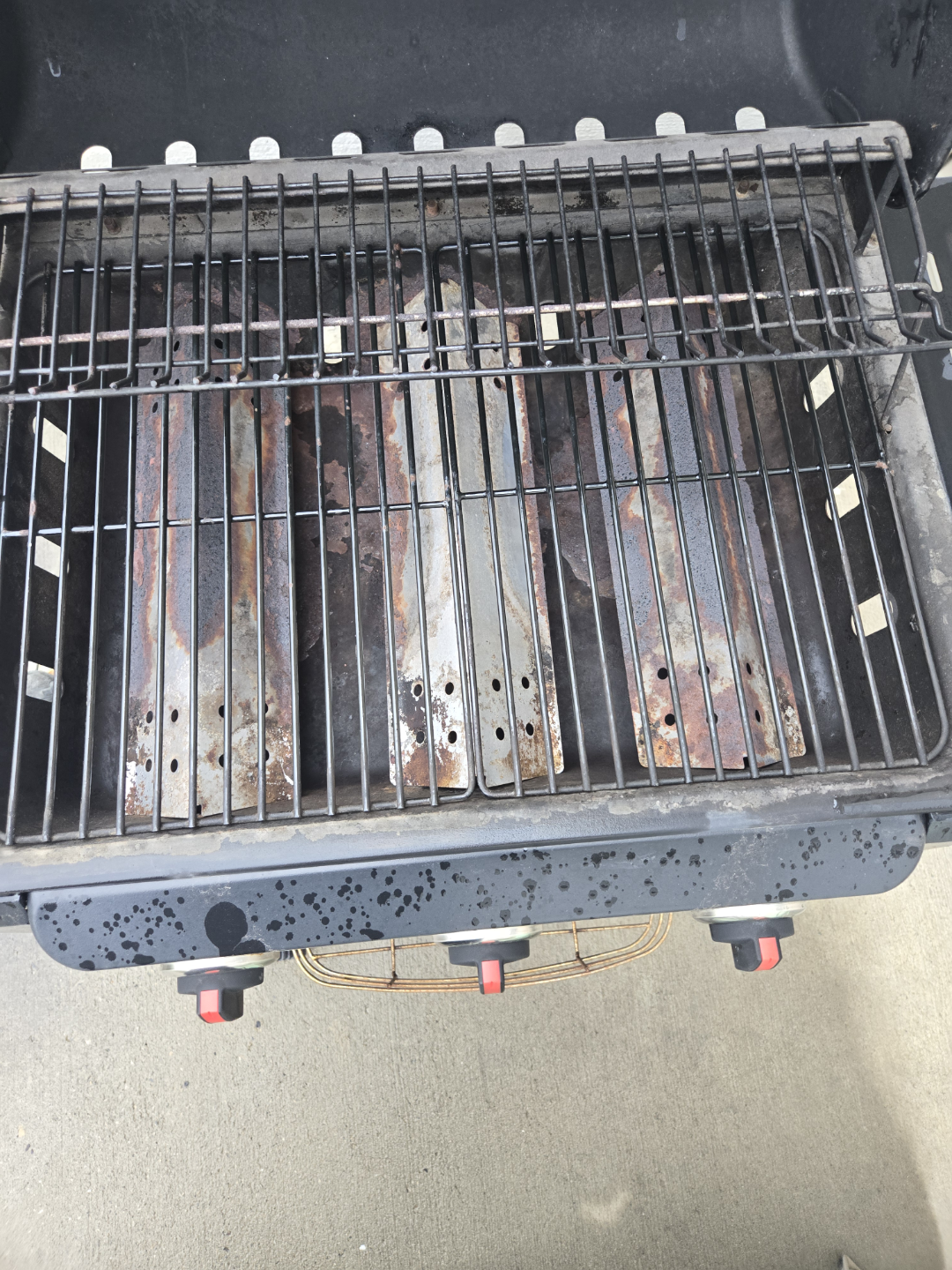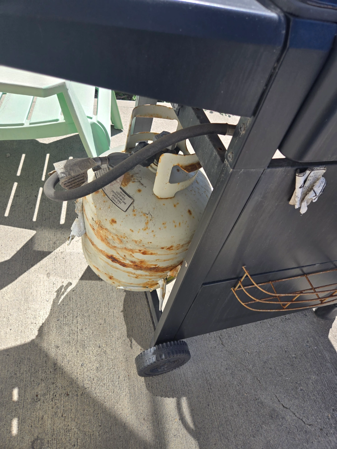 Black propane BBQ grill. Three burners. Features a side burner. Includes propane tank, showing some rust. Good for smaller gatherings.