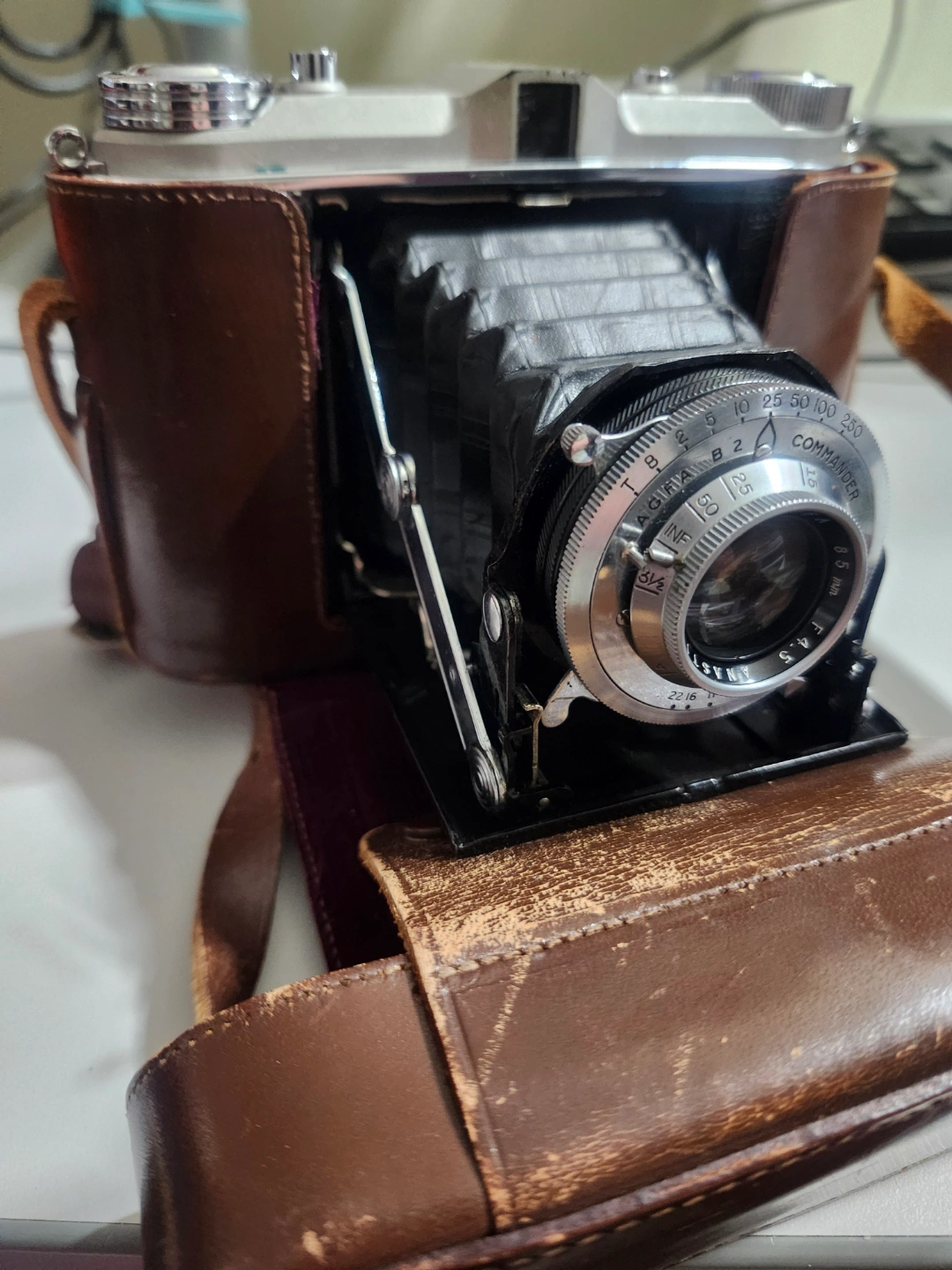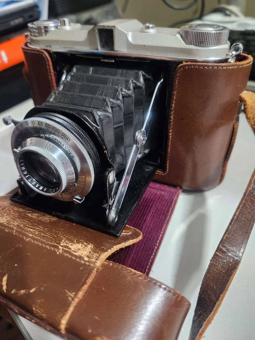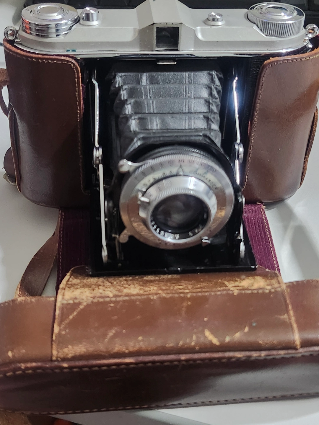 Antique Agfa folding camera. Leather case included. Shows wear consistent with age. Excellent collectable item.