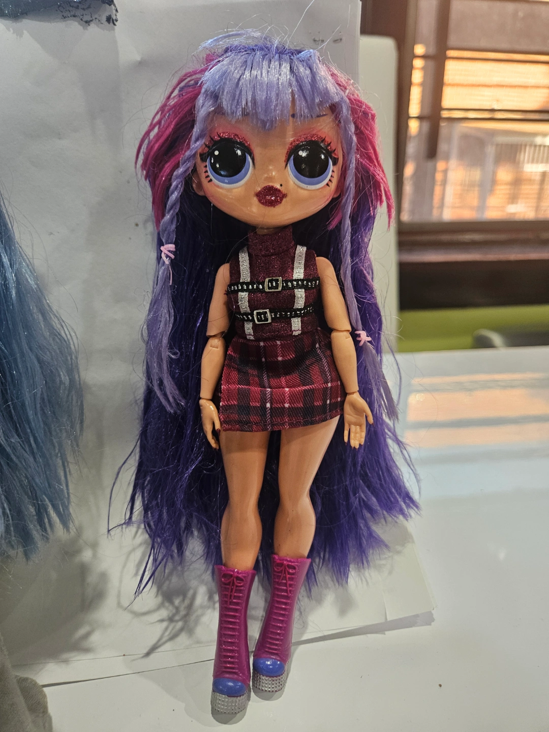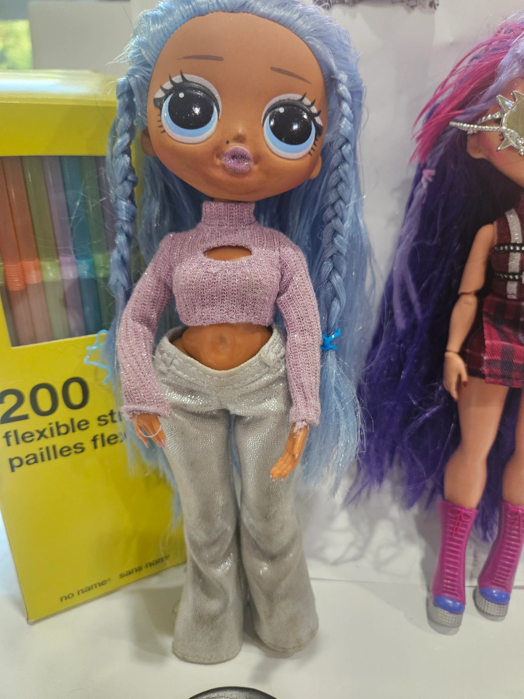 Two LOL Surprise OMG fashion dolls. One doll has light blue hair, the other has purple and pink hair. Includes several extra outfits and accessories. Great for collectors or playtime. $30 each or both for $60