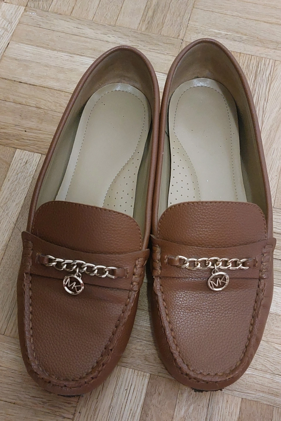 Michael Kors Brown Leather Loafers. Women's brown leather shoes. Gold chain detail. Slip-on style. Good condition.