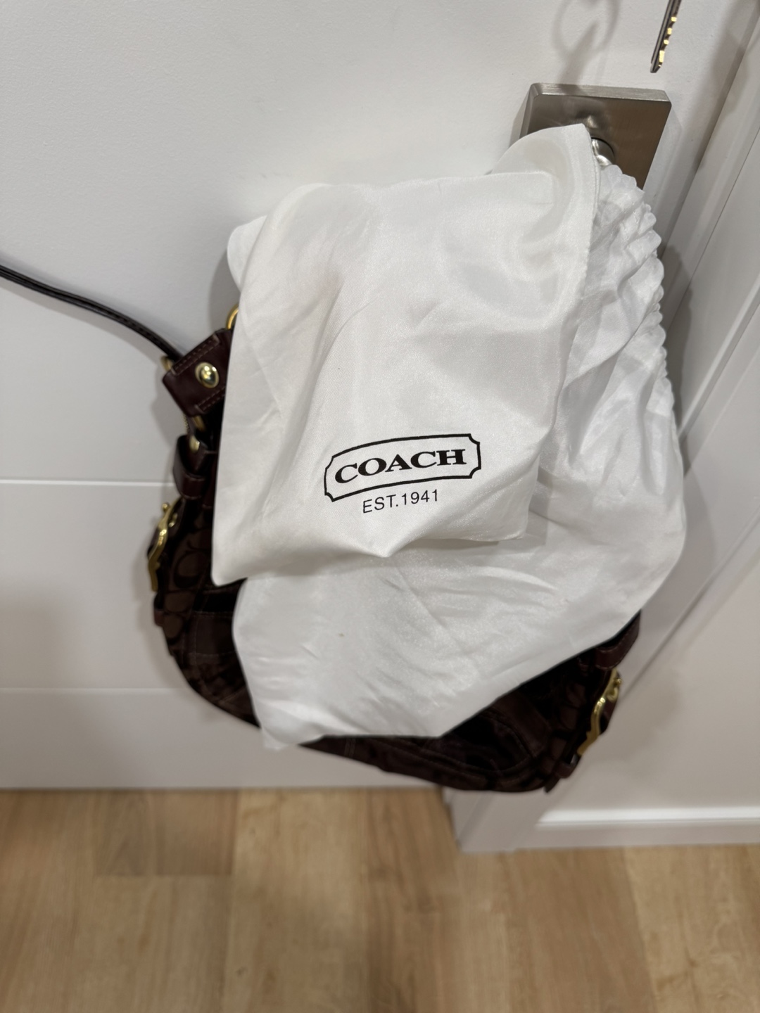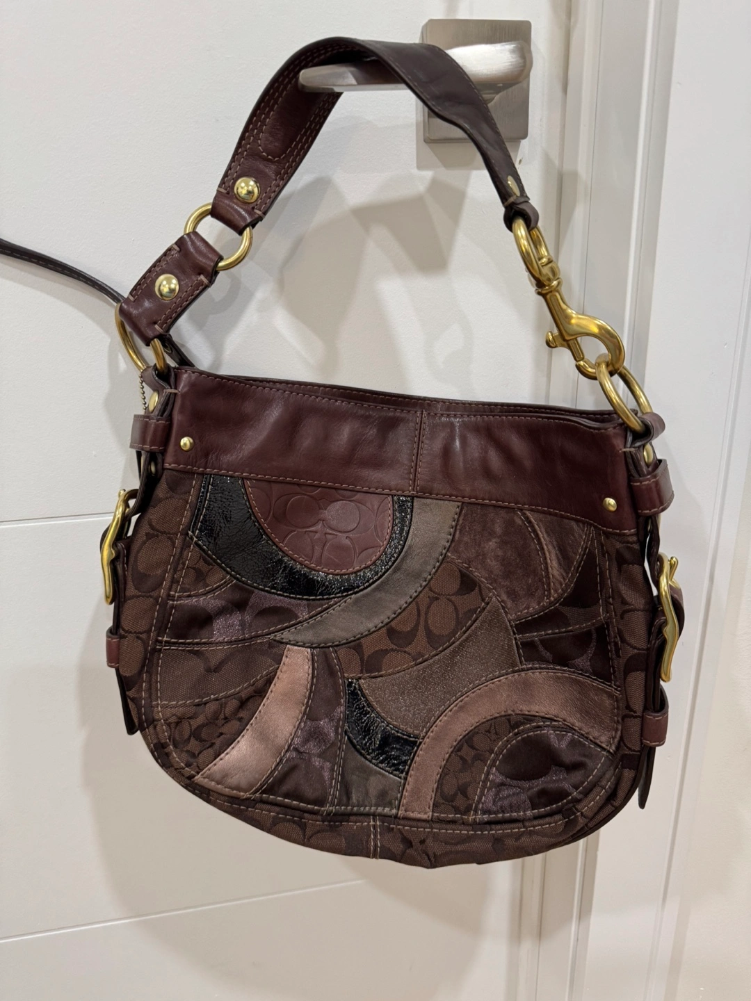 Pre-owned Coach shoulder bag. Brown leather and canvas patchwork design. Gold-toned hardware. Comes with dust bag.
