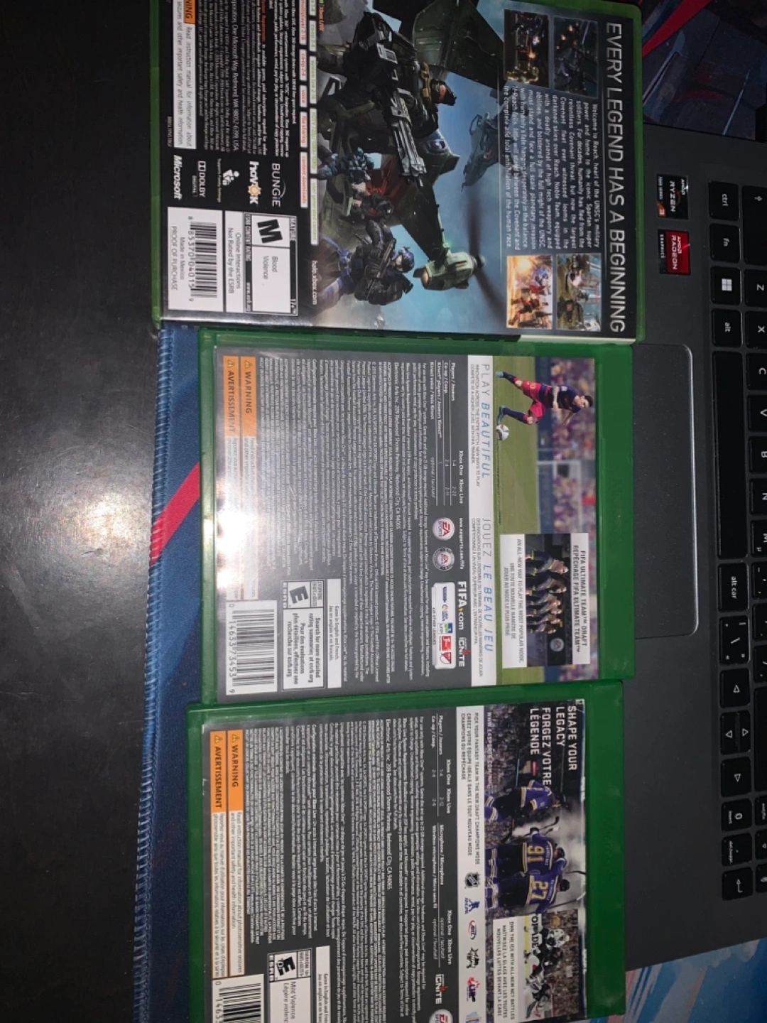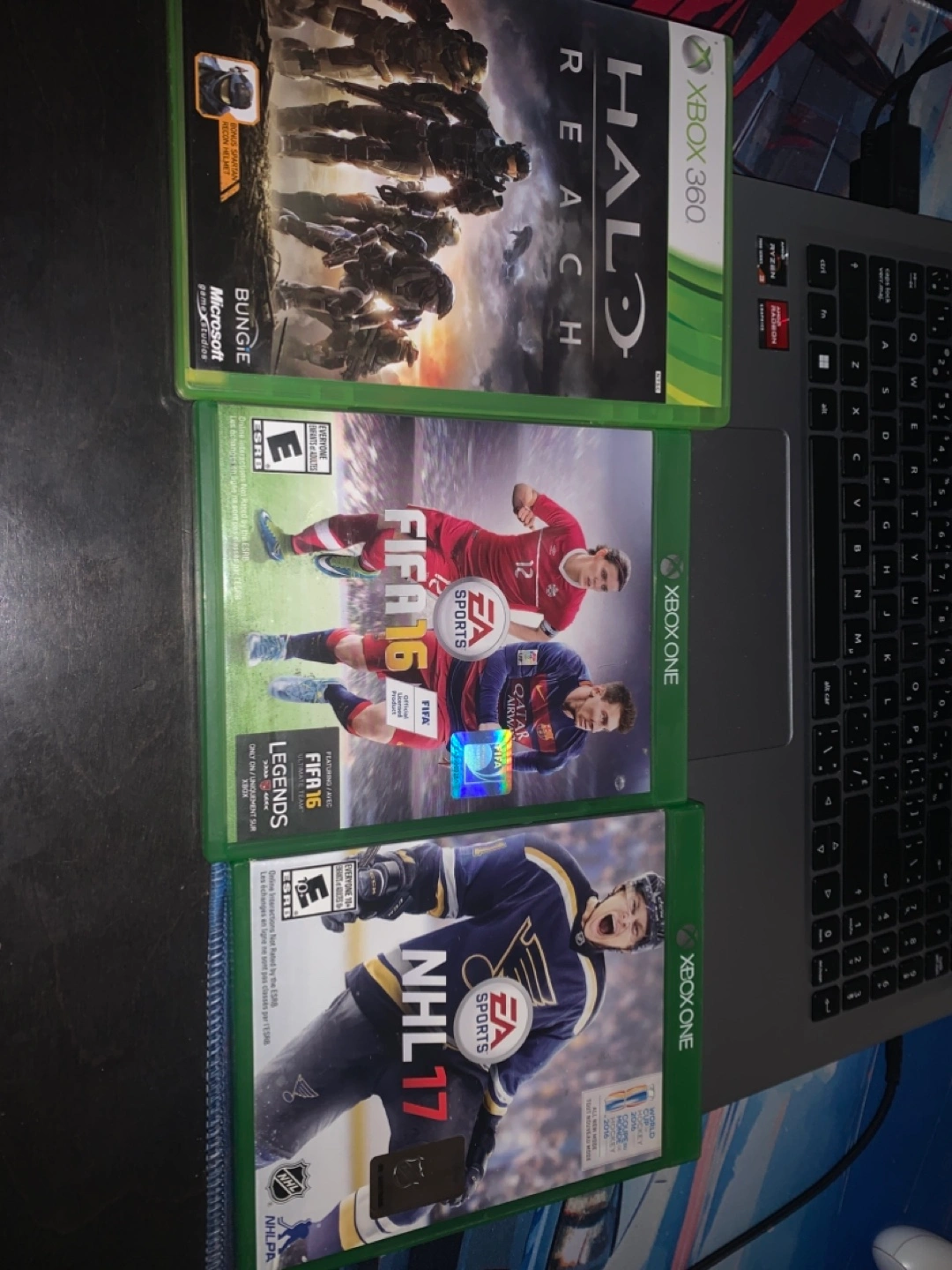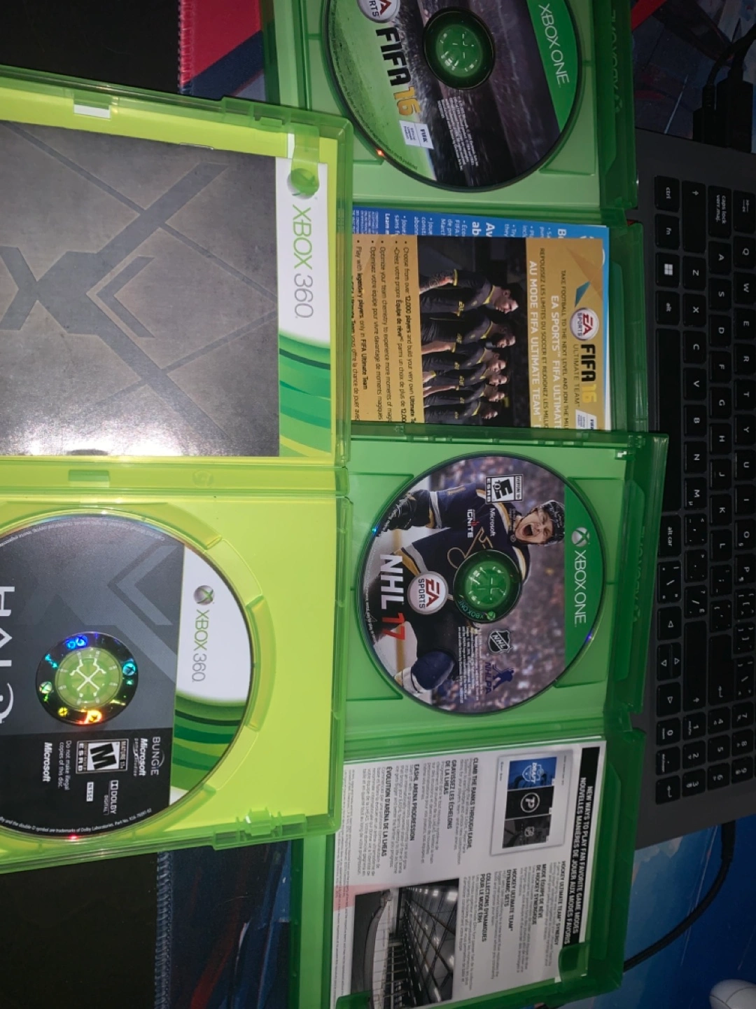 Three pre-owned video games for sale. Includes Halo: Reach for Xbox 360, FIFA 16 and NHL 17 for Xbox One. Discs, manuals and cases included.