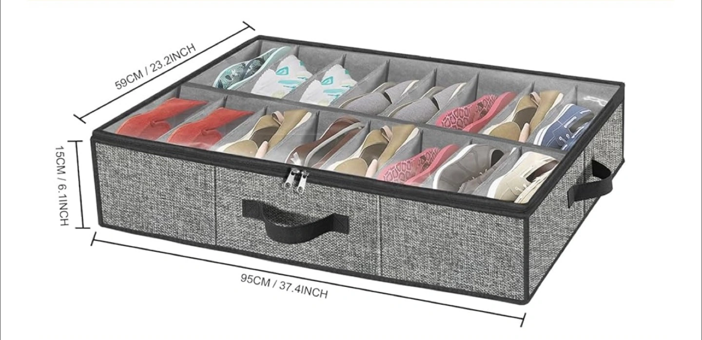 97Grey fabric shoe storage box. Holds 12 pairs of shoes. Clear top for easy viewing. Zipper closure and handle for easy transport. Great for under the bed