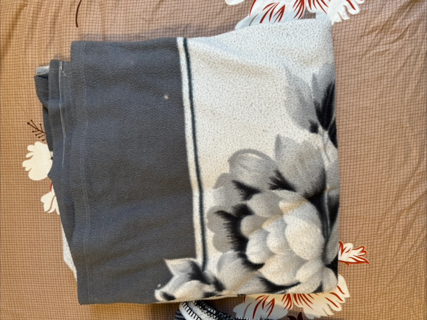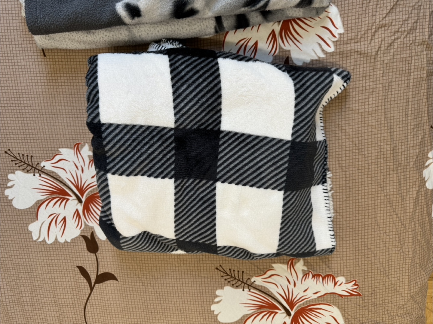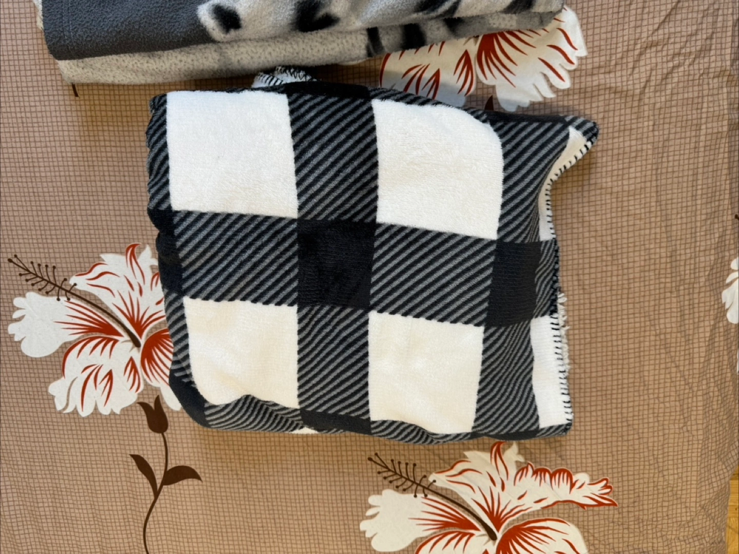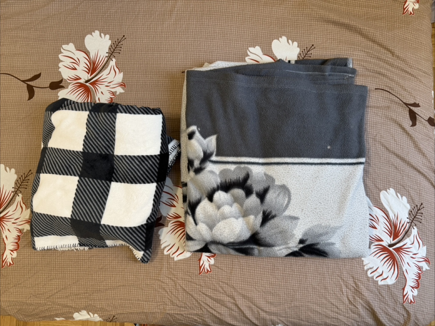 Two cozy fleece blankets. One (single bed size) features a black and white buffalo check pattern, the other (full bed size) a grey and white floral design. Perfect for snuggling on the couch or adding extra warmth to your bed.