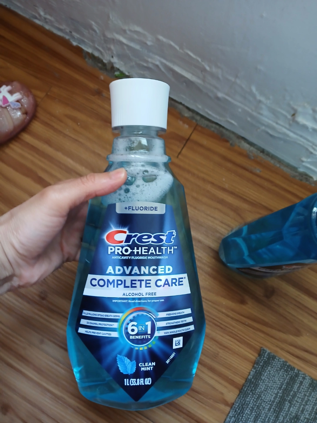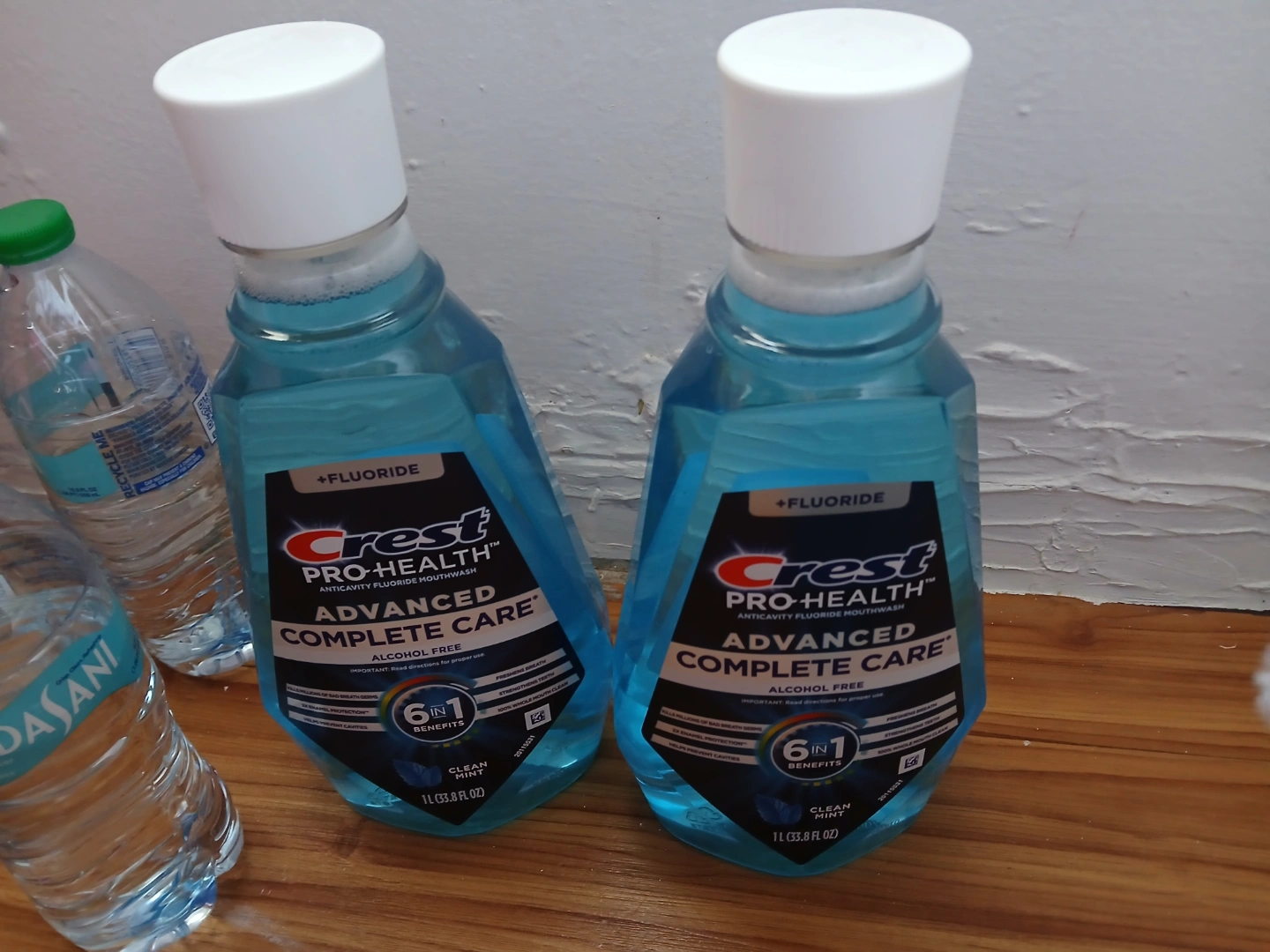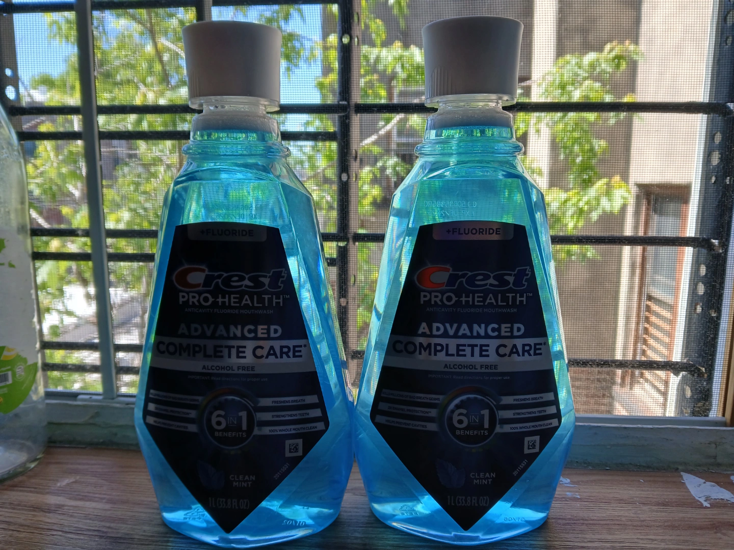 Two bottles of Crest Pro-Health Advanced Complete Care Alcohol-Free mouthwash. Clean Mint flavor. Fluoride added. 1L (33.8 fl oz) each. Expiry date December 2026.