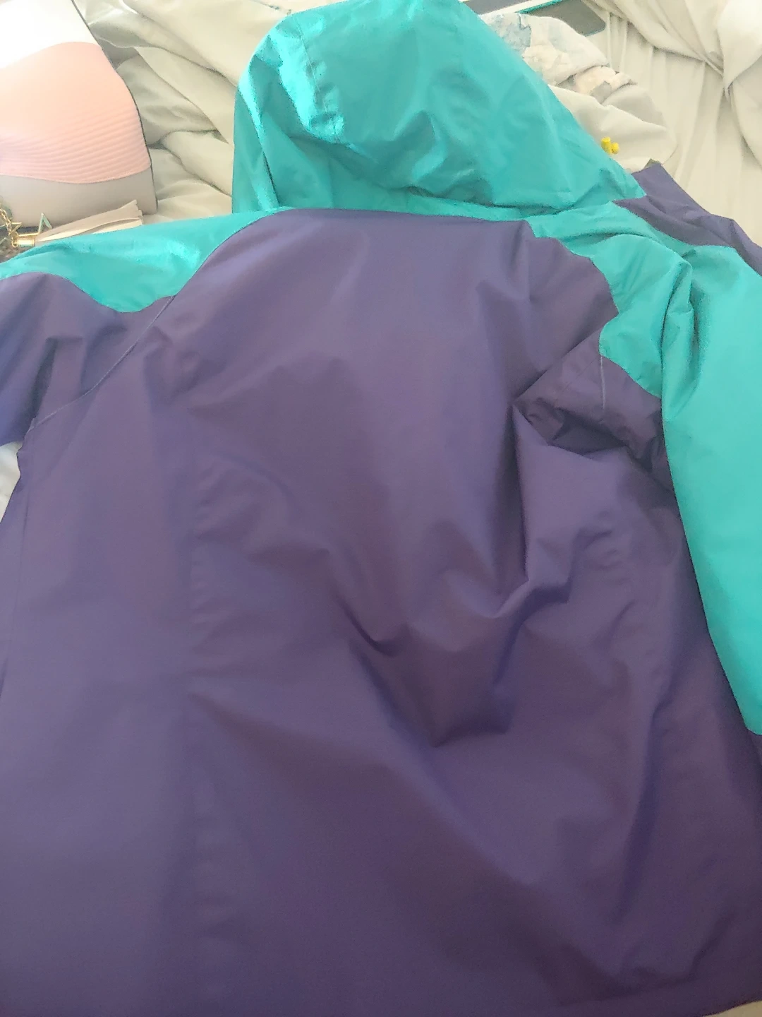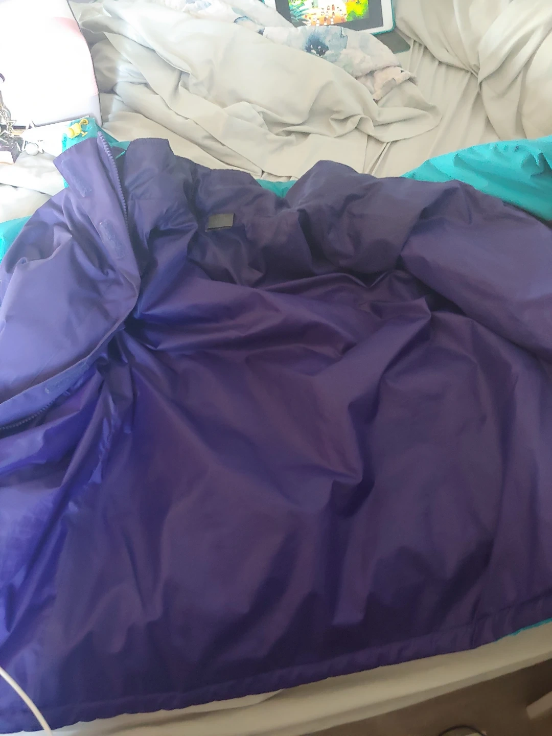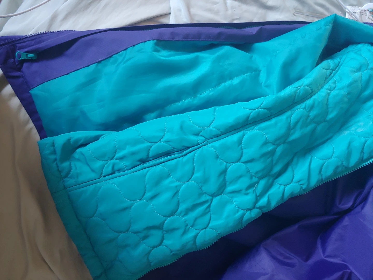 Reversible puffer jacket. Two-toned colour scheme. Purple and teal. Zipper closure. Great for layering.