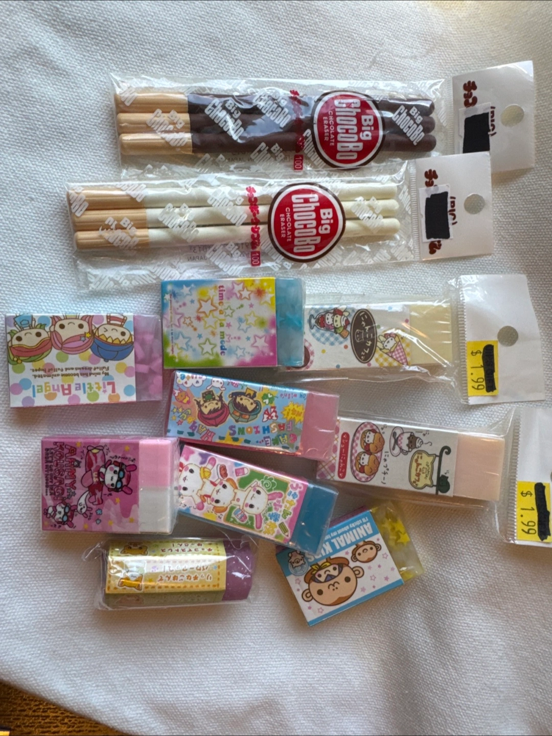 Bulk lot of cute Japanese erasers. Includes various designs and two packages of Big ChocoBo chocolate erasers. Perfect for stationery lovers or collectors. All made in Japan except the hexagon one, made in TW
