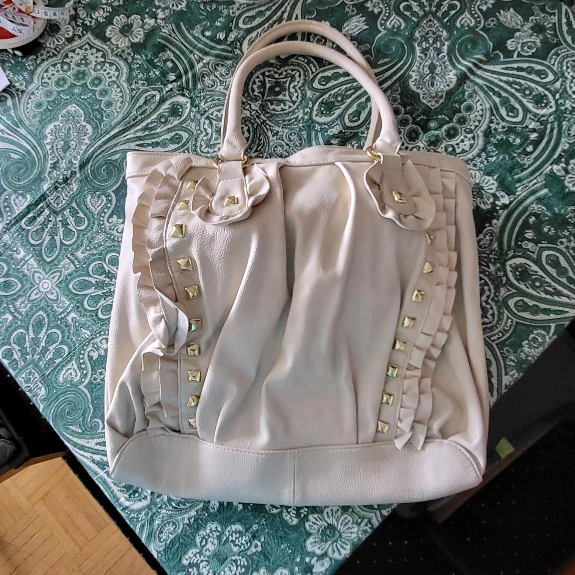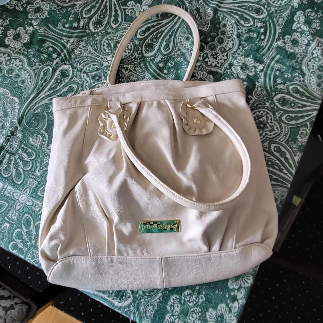 70Pre-owned Betsey Johnson tote bag. Cream-coloured faux leather. Features ruffles and gold-toned studs. Interior lining has a fun design. Two top handles. Zipper closure. 2 elastic pouches inside along with a zippered pouch. All Sales Final. No returns. Cash only please. Thanks.