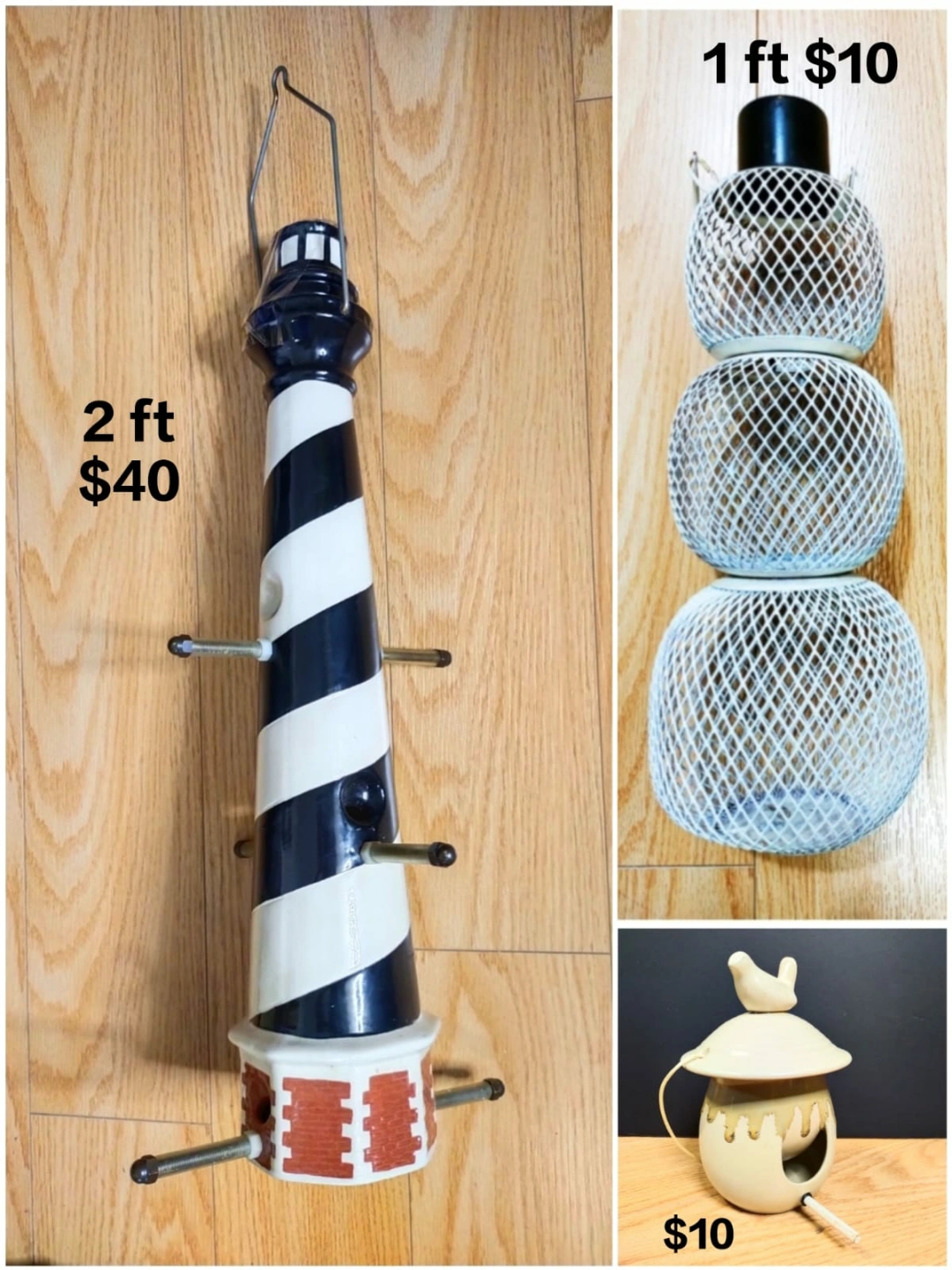 Set of three bird feeders. One large lighthouse-shaped feeder, approximately 2 feet tall, $40. One smaller, tiered feeder, approximately 1 foot tall, $10. One small, ceramic bird feeder, $10.