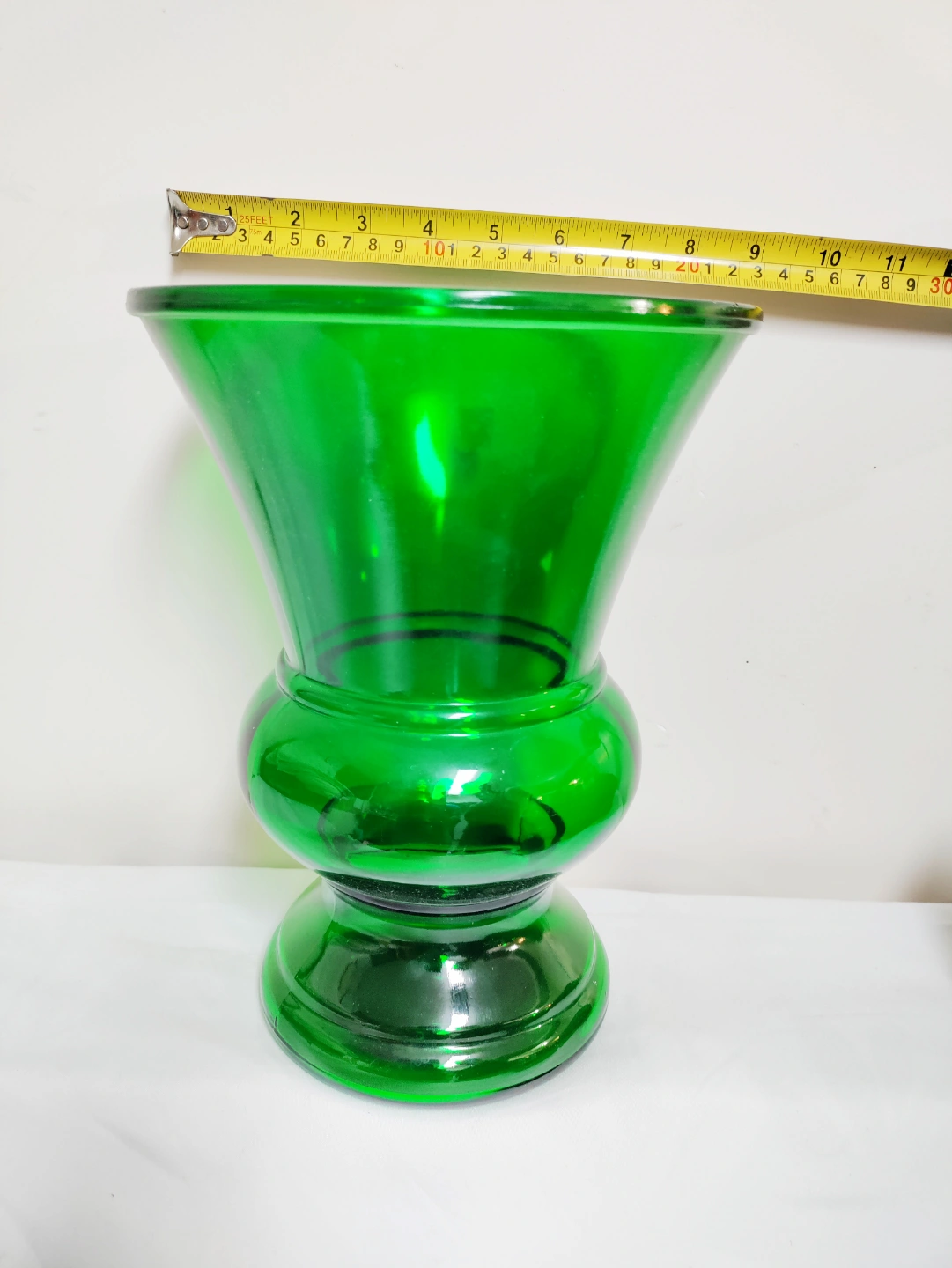 Beautiful, vintage emerald green glass vase. Elegant design, perfect for floral arrangements or home decor. Approximately 10 inches tall. Shows some minor wear consistent with age.