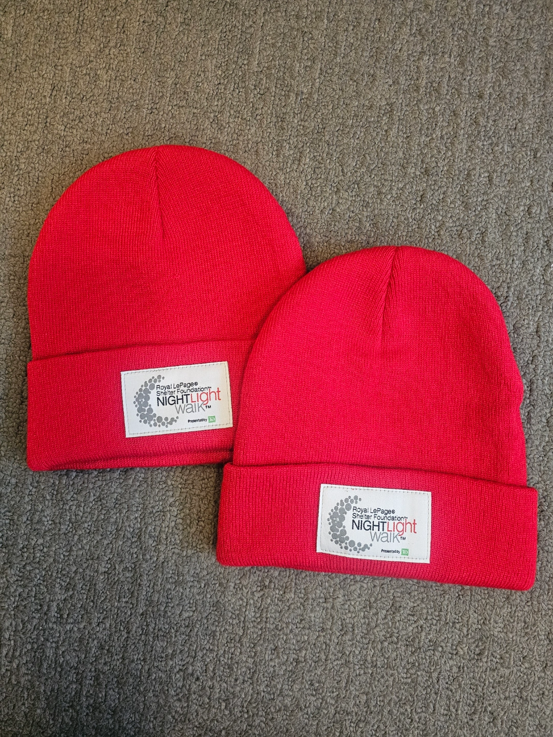 Pair of red knit winter beanies. Feature small logo patch in support of Women's Shelters.