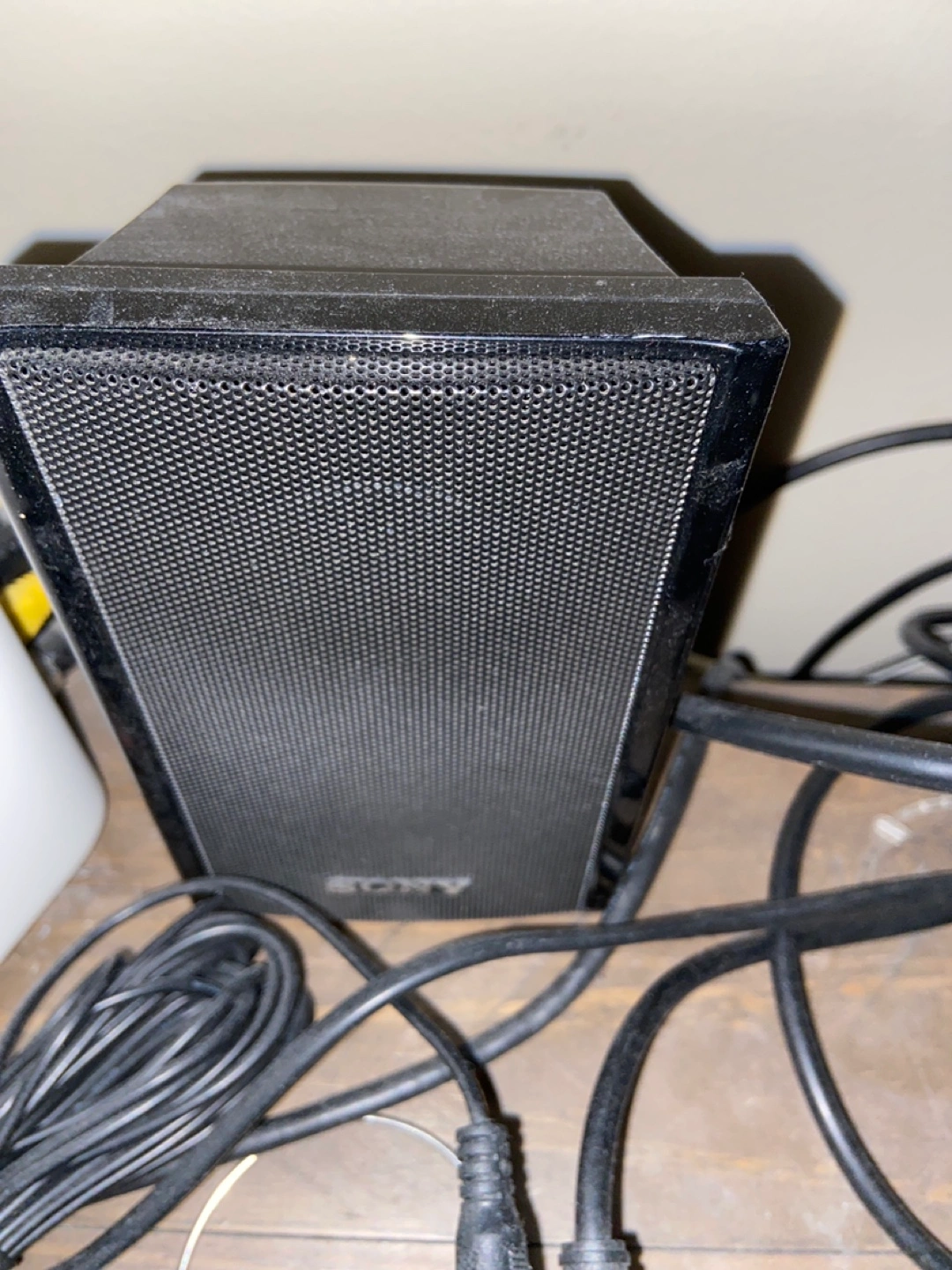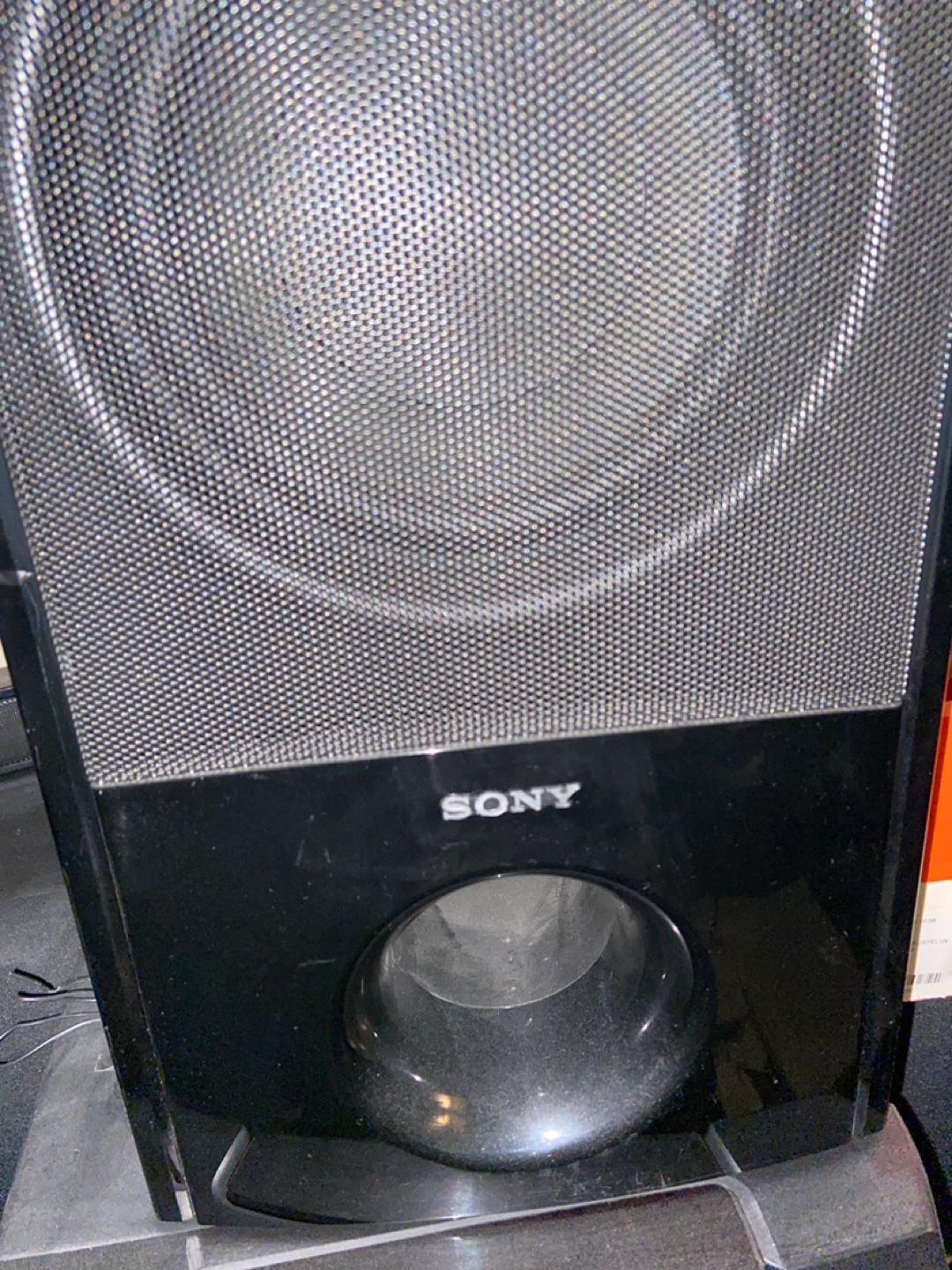 Complete Sony home theatre system. Includes subwoofer, two satellite speakers, and receiver. Great sound quality. Pre-owned, some minor wear. 6 pcs unit