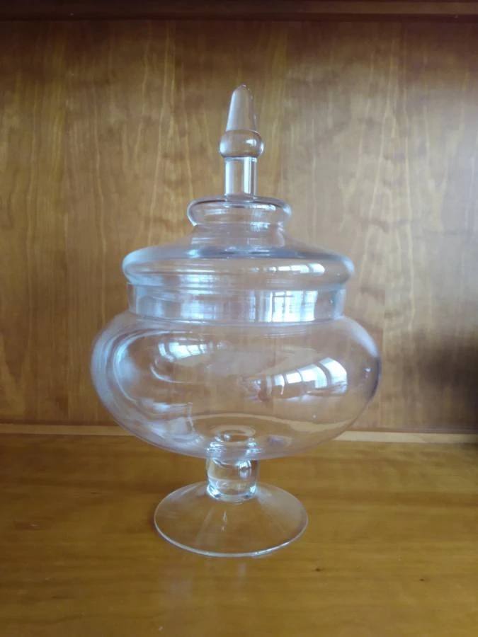Clear glass candy dish. Features a footed base and a dome lid with a finial. Perfect for candy, treats, or decorative purposes.
