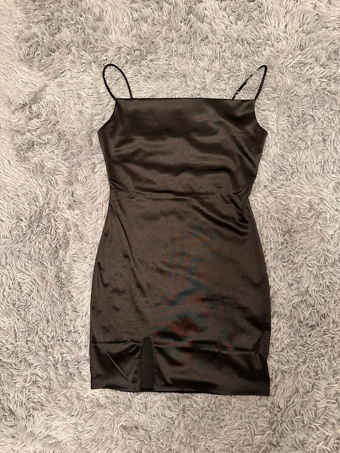 Stunning black mini dress. Features a square neckline and thin straps. Made of a silky satin material. Side slit. Perfect for a night out.
