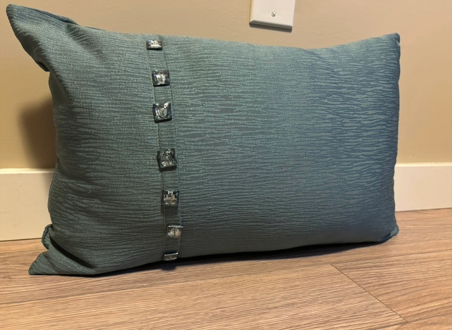 Turquoise filled cushion made of polyester with pretty beaded rhinestone detail, reversible sides.