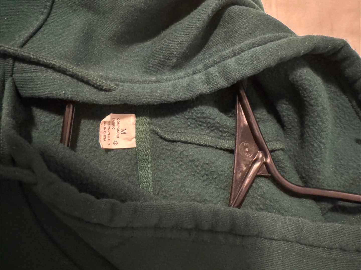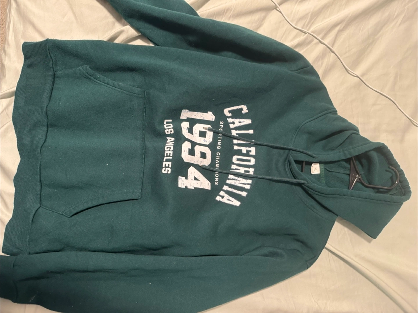 Dark green hoodie. Size medium. Features a vintage-style California 1994 Los Angeles graphic on the front. 60% cotton, 40% polyester.