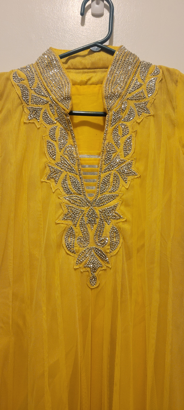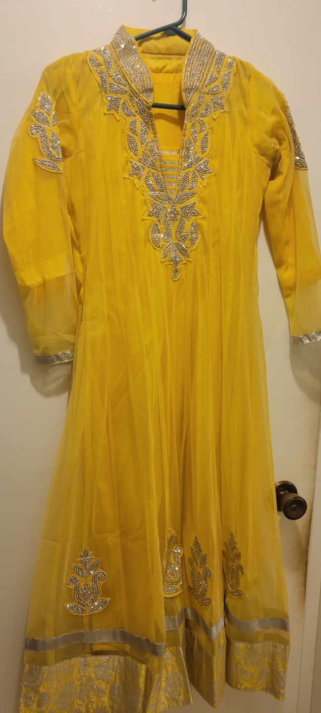 Beautiful yellow salwar kameez. Embellished neckline and hem. Three-quarter sleeves. Includes matching pants and dupatta. Lightweight fabric, perfect for warmer weather.pickup near Burcoquitlam skytrain Station .size extra small.New condition