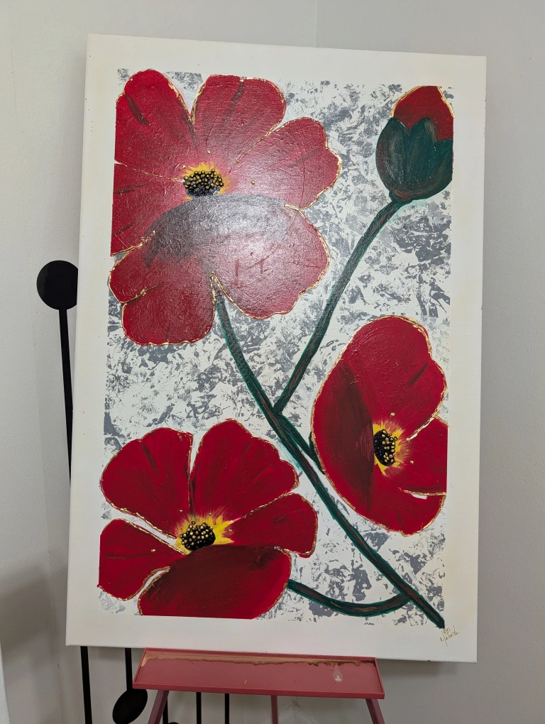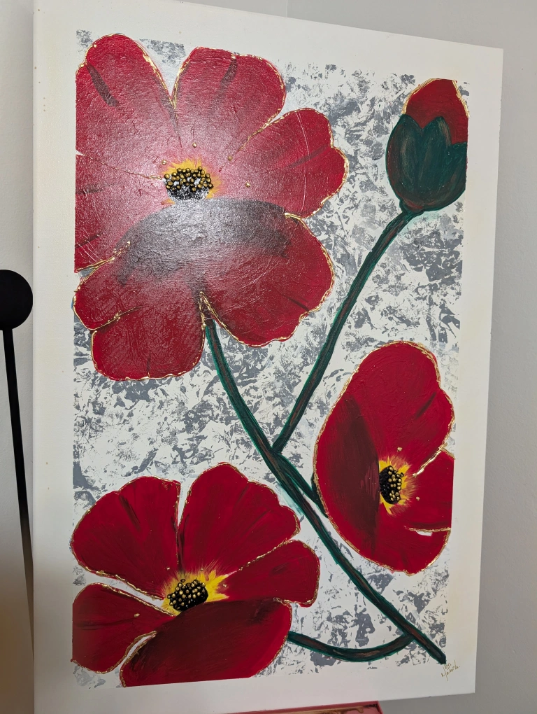 Original artwork. Features red poppies on a textured silver background. Gold accents. Large square canvas. Artist signature in bottom right corner.