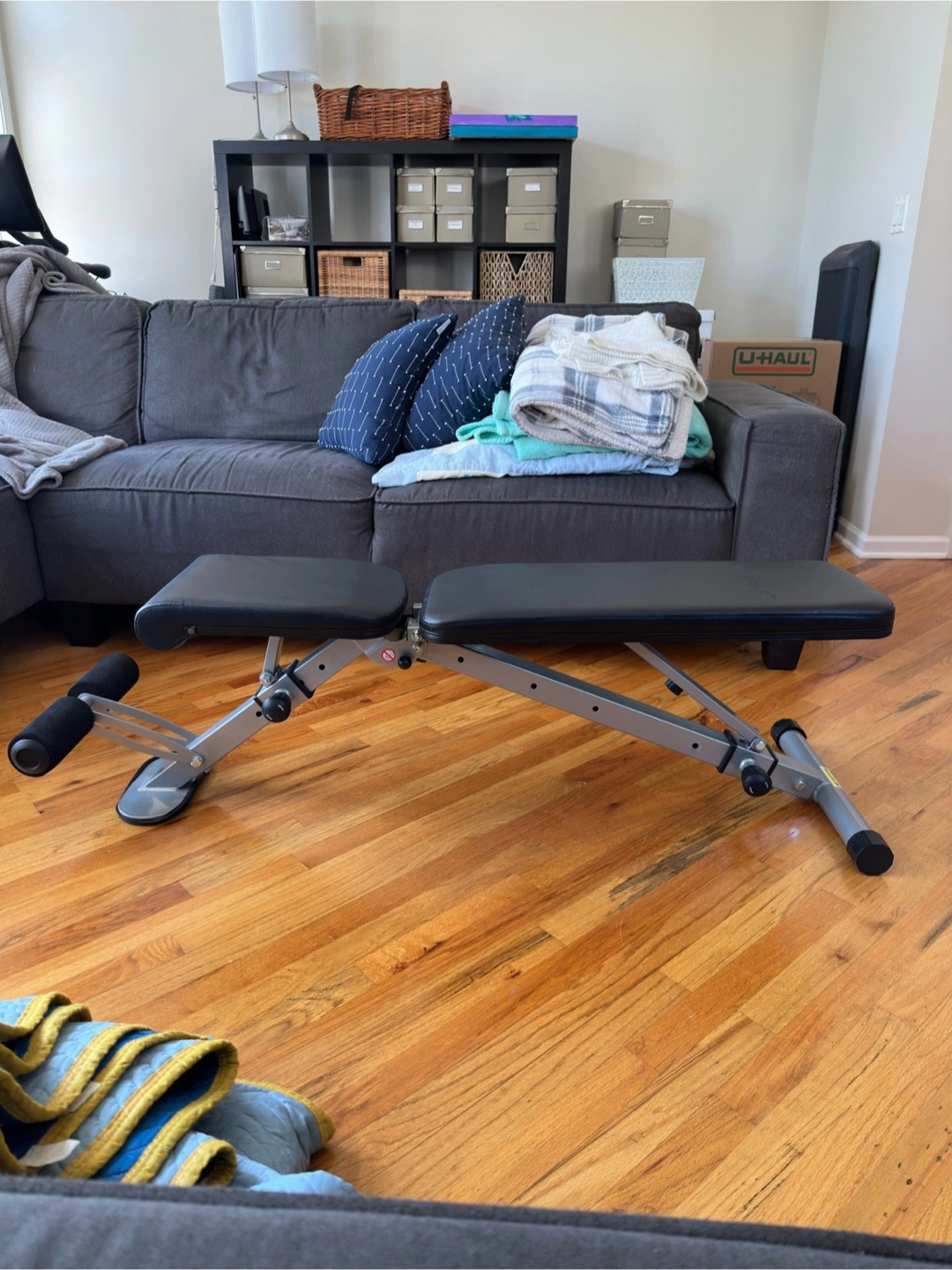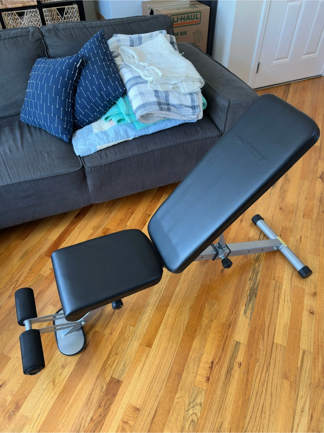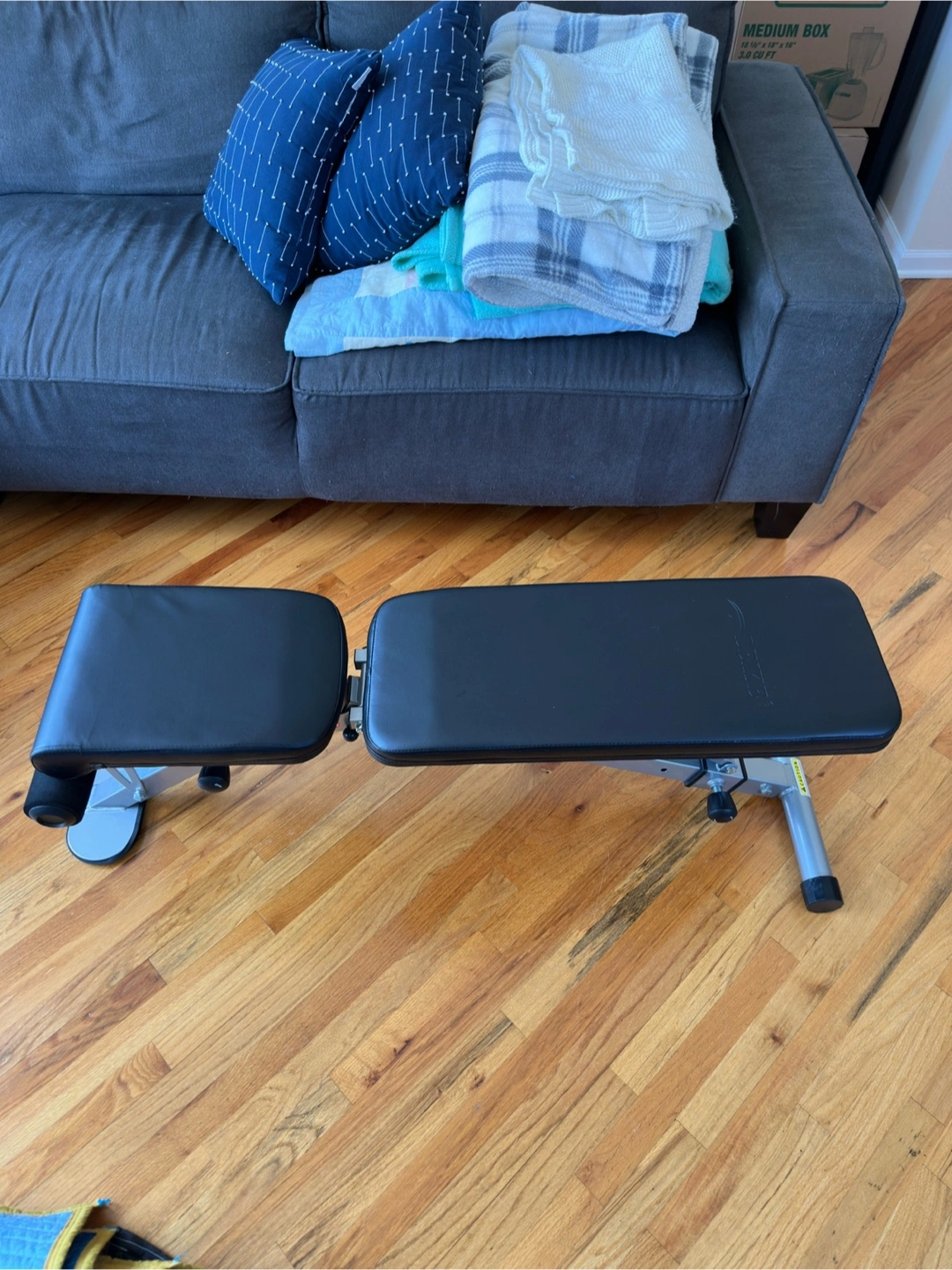 Foldable weight bench. Space-saving design. Black padded seat and backrest. Silver metal frame. Adjustable incline. Great for home workouts. Bench is 4 ft flat.