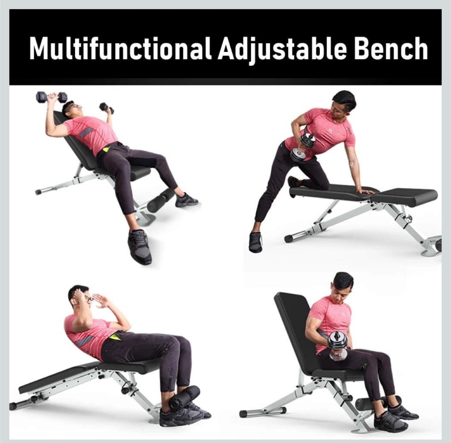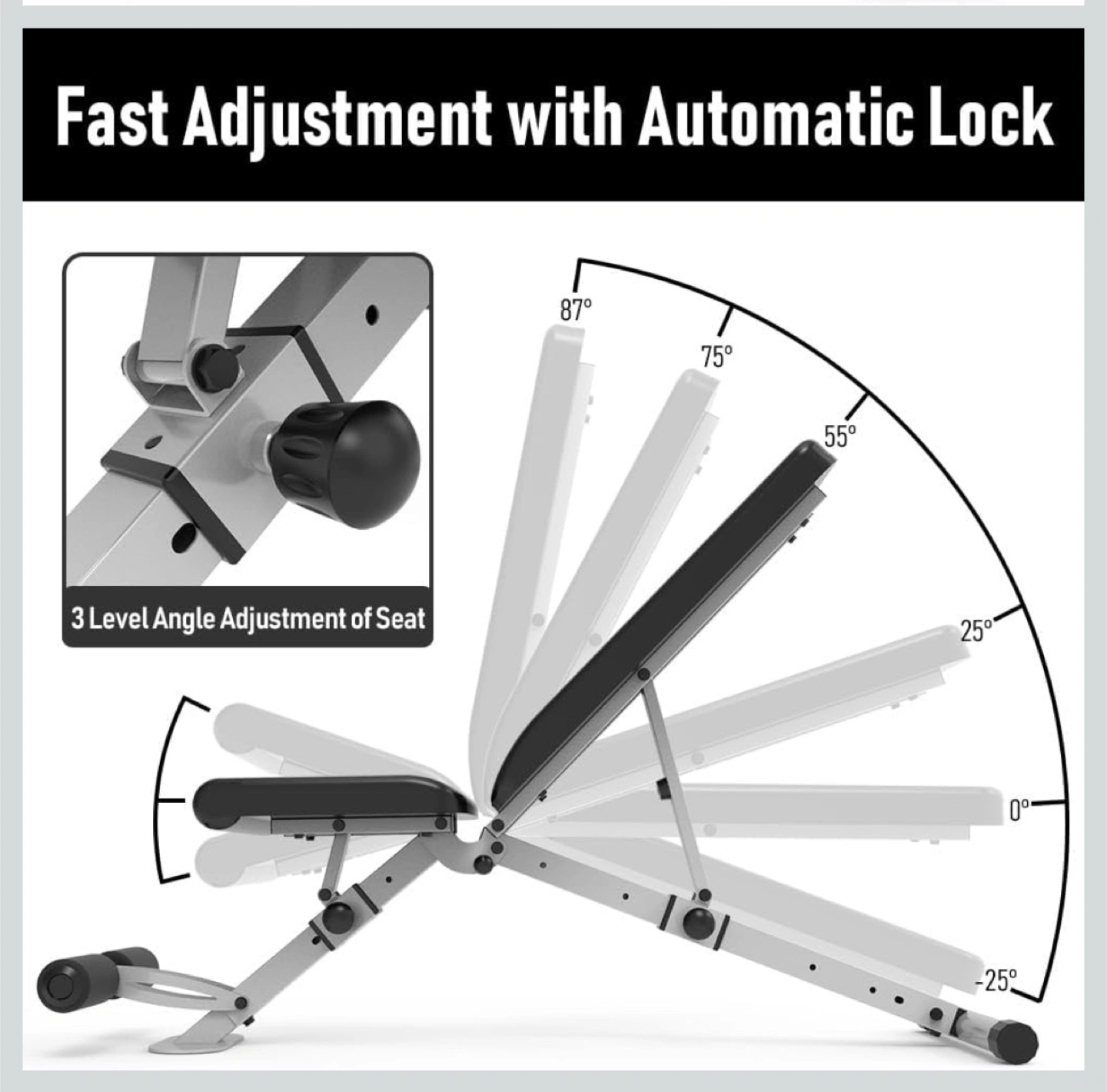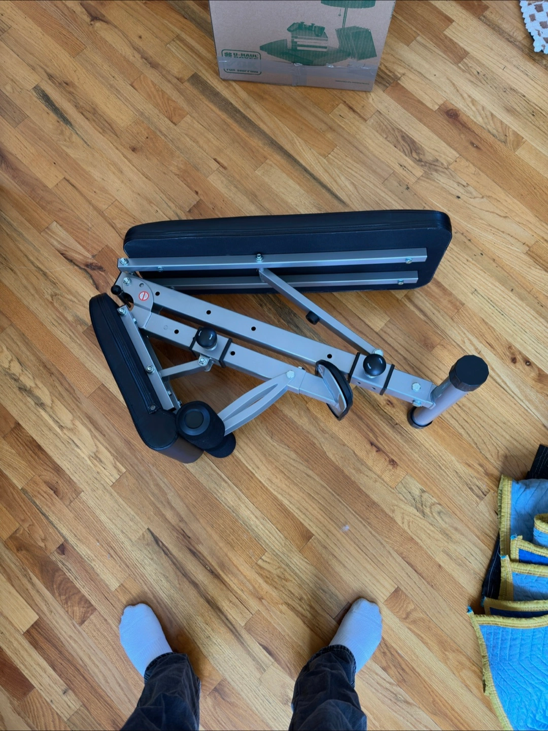 Foldable weight bench. Space-saving design. Black padded seat and backrest. Silver metal frame. Adjustable incline. Great for home workouts. Bench is 4 ft flat.