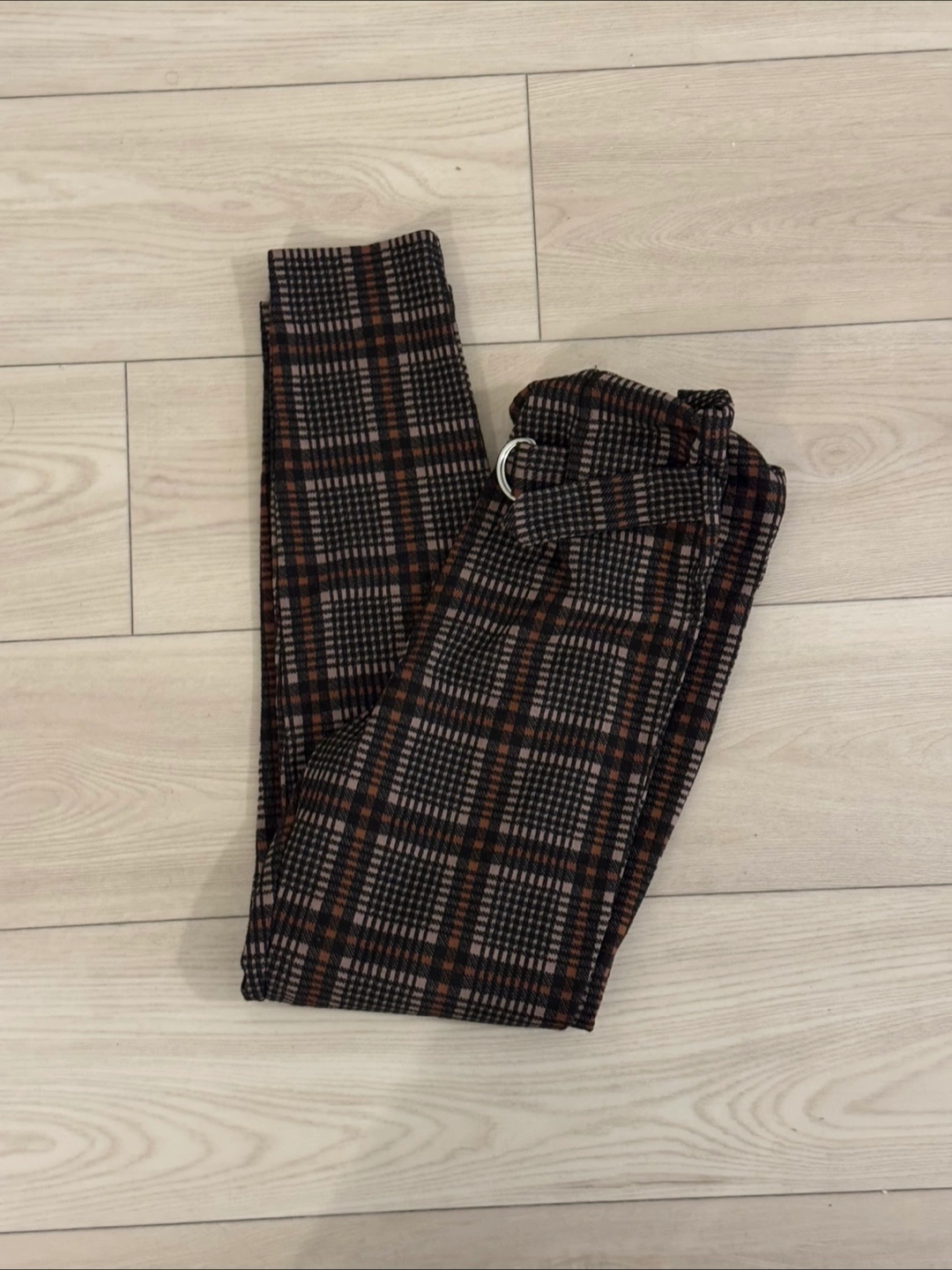 Great condition, hardly worn! Comfy and flattering pull-on plaid trousers from forever 21 with a belted detail along the front sides. Stretchy waistband, fits sizes 0 - 6. No pockets unfortunately.
