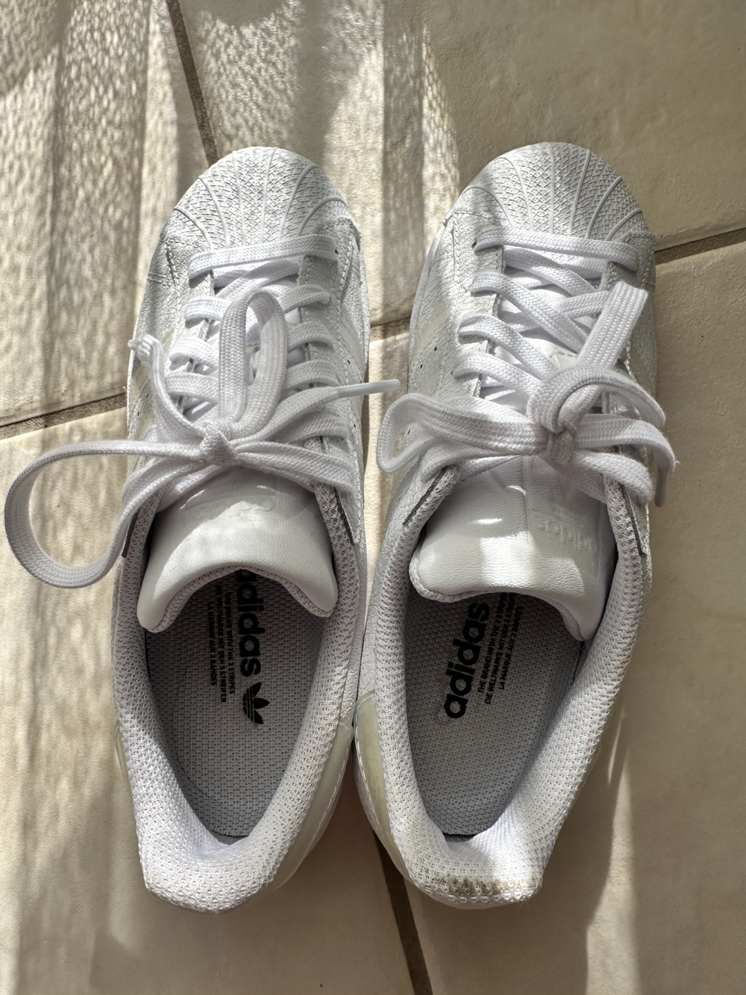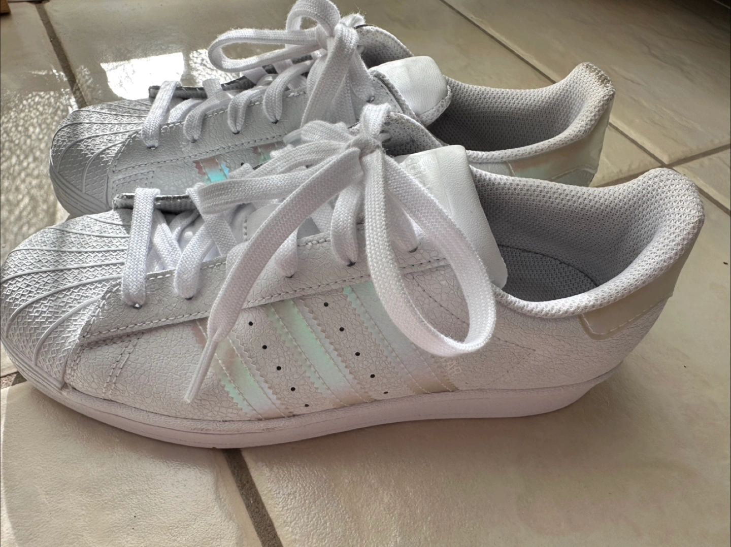 White leather Adidas Superstar shoes. Iridescent stripes. Brand new. Women's size. Lace-up closure.