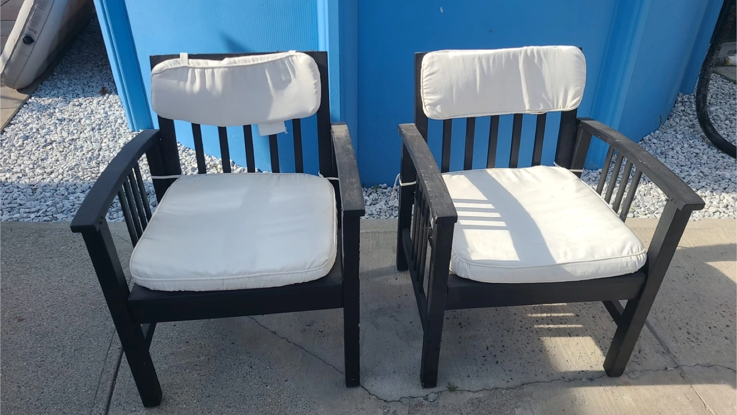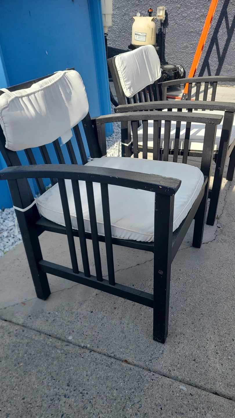 Two black wooden outdoor chairs. Vertical slat design. Includes off-white cushions. Good for porch, patio, or deck.
