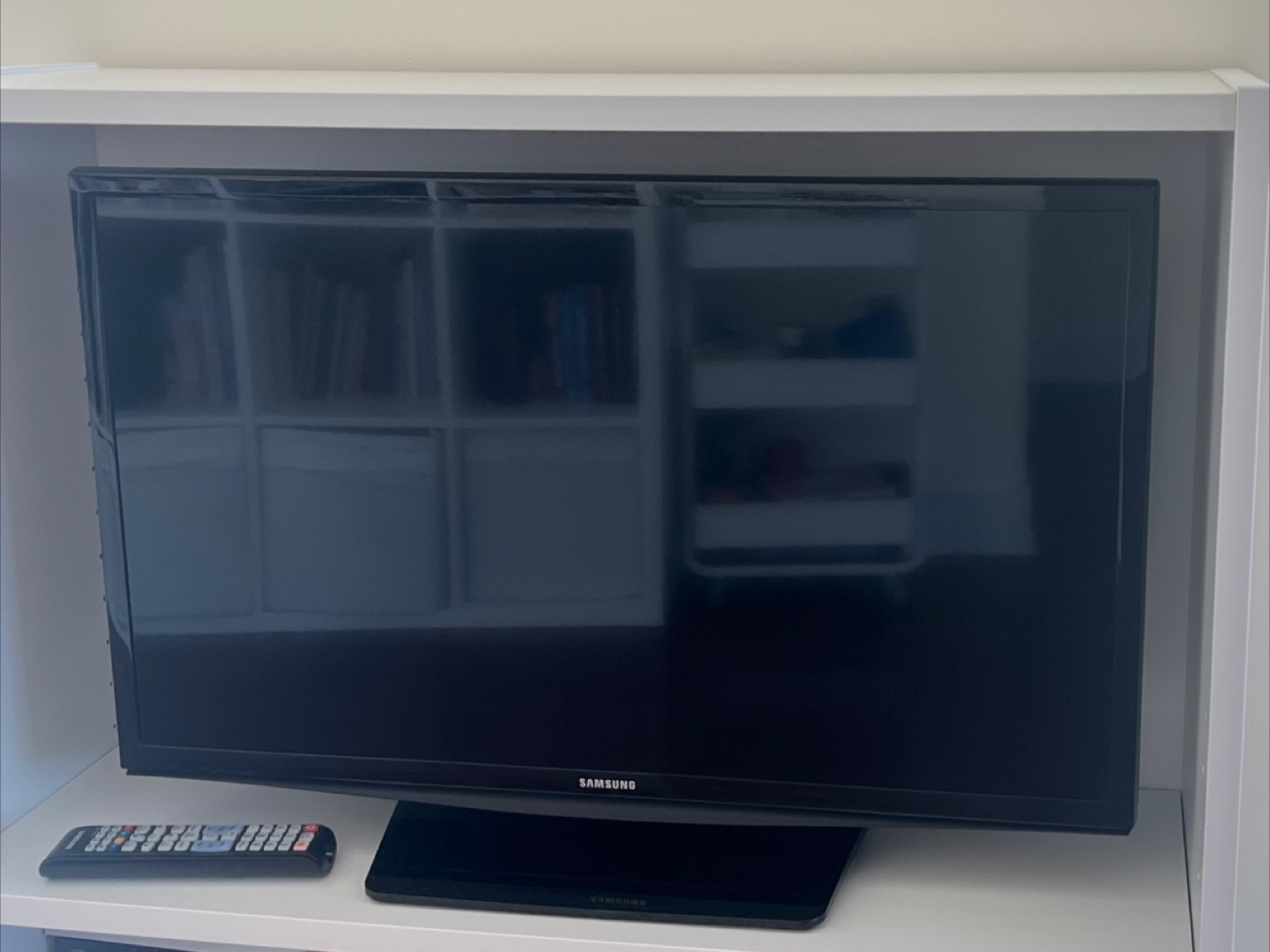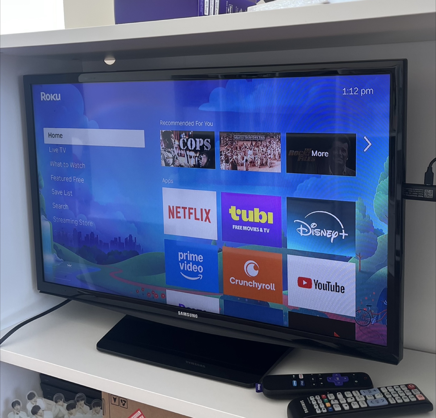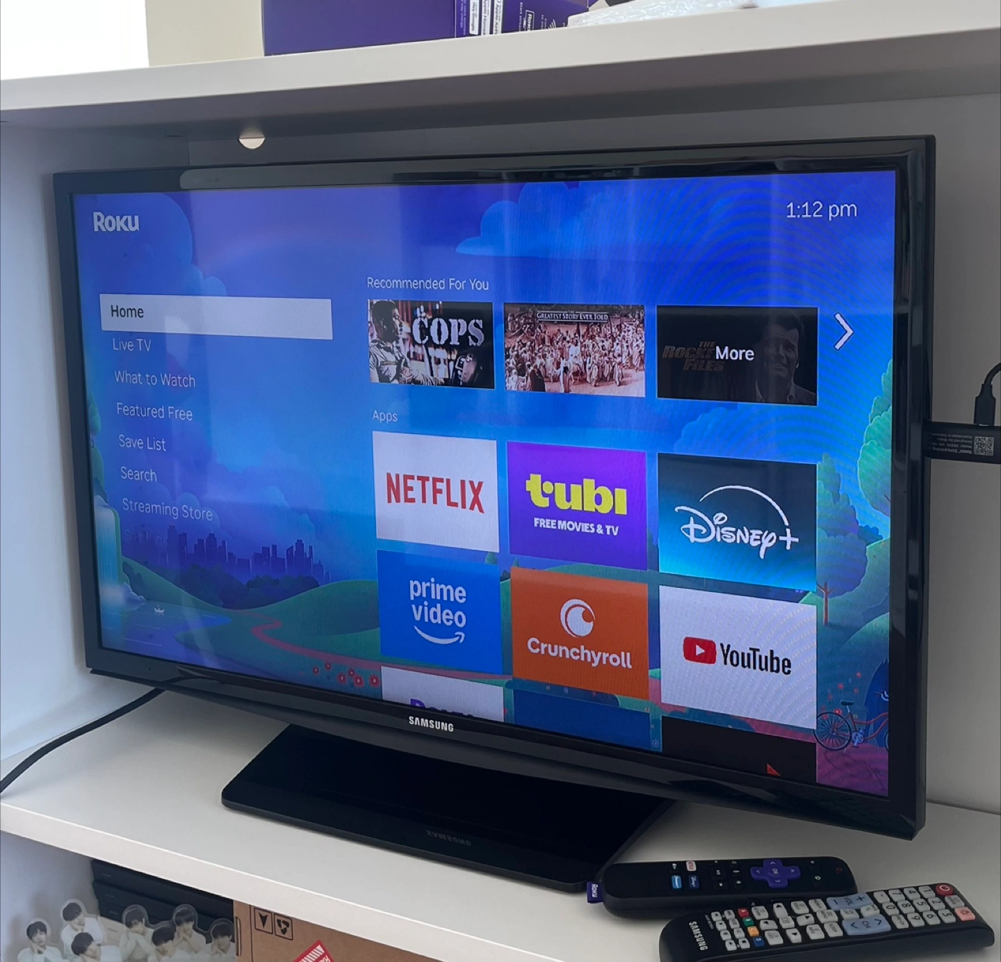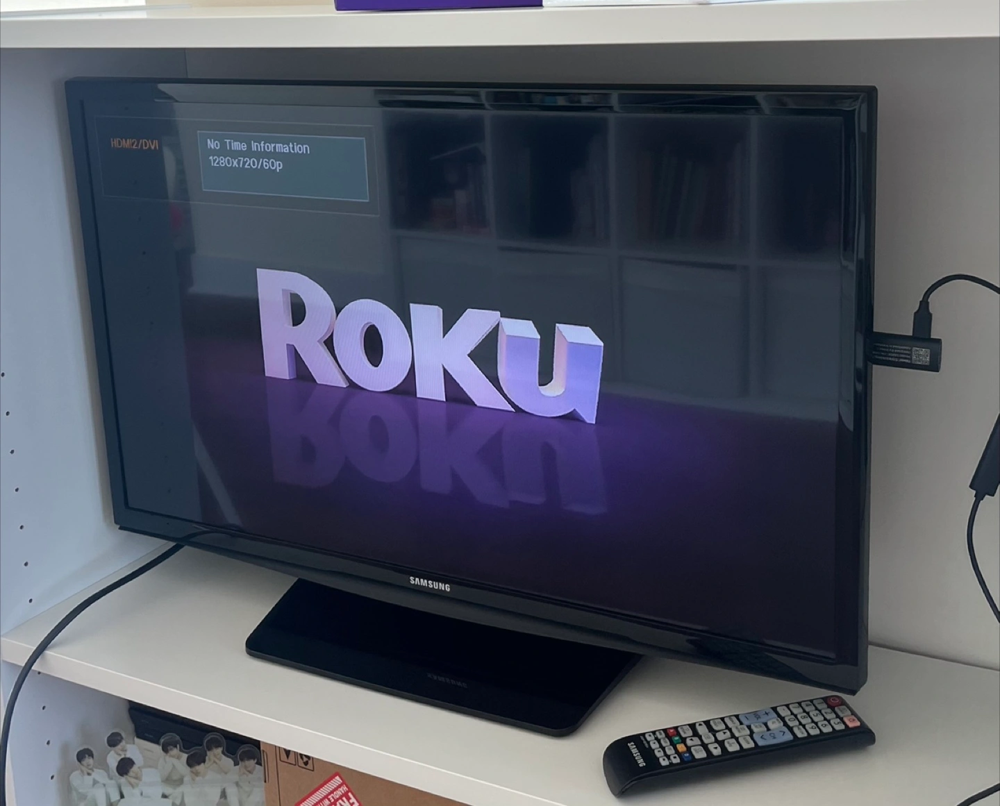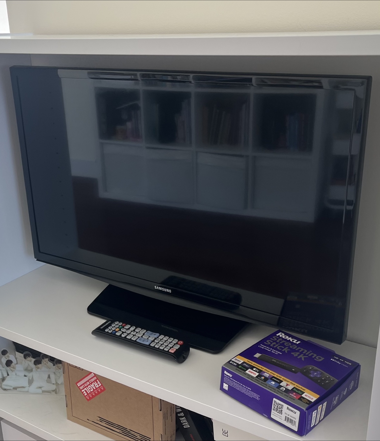 Samsung TV with a 27 inch screen and a Roku Streaming Stick 4K to make it function as a smart TV!